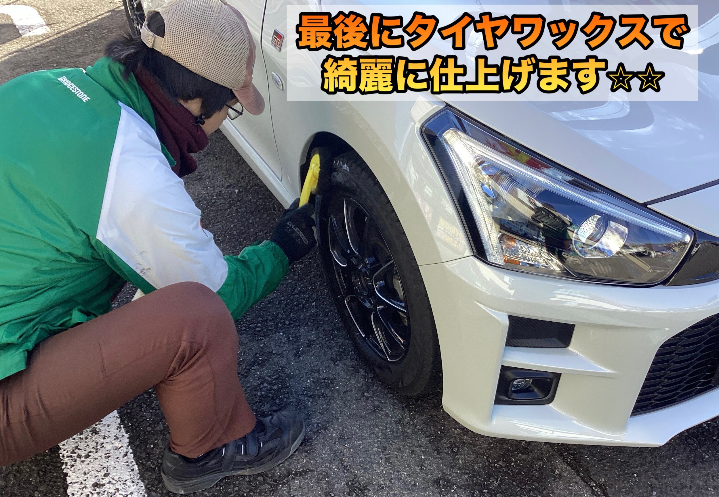 最後はタイヤワックスを使って綺麗に仕上げて点検完了となります!
