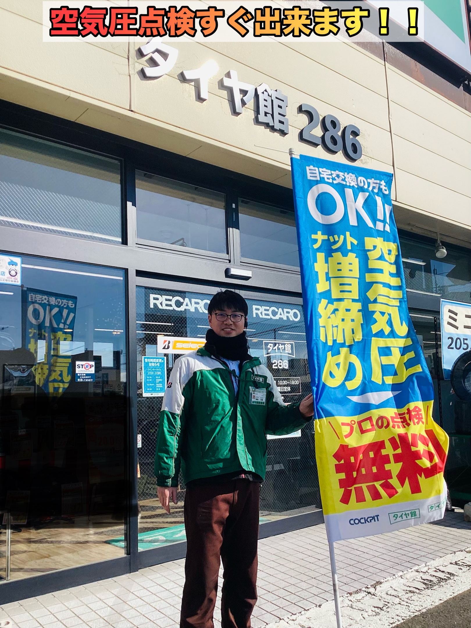 空気圧点検は無料で今の時期ですとすぐに点検出来ますので