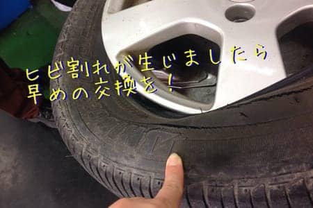 表面に小さなヒビが見受けられ、タイヤの製造年月日も確認したところ、5年以上もご使用になられてるとのこと。