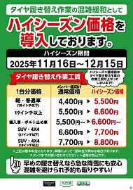 みなさんこんにちはタイヤ館286です タイヤ交換のシーズンも近づいてきましたね 今年、当店は春シーズン同様にハイシーズン価格を導入しております。 この期間は通常料金から+¥1100上がる金額でご案内致します。 ご理解の程よろしくお願いします。 ブリヂストンオンラインストアならWEBで、いつで...