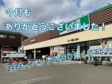 皆さまこんにちは、仙台市の長町エリアにありますタイヤ館286です! 1月も本日で最終日となりました!2026年もあっという間に過ぎてしまいそうですね…。 今月も沢山のご来店、誠にありがとうございました! 来月もイベント盛り沢山となっております! 2026年2月1日から2月28日までエア点検キャンペ...