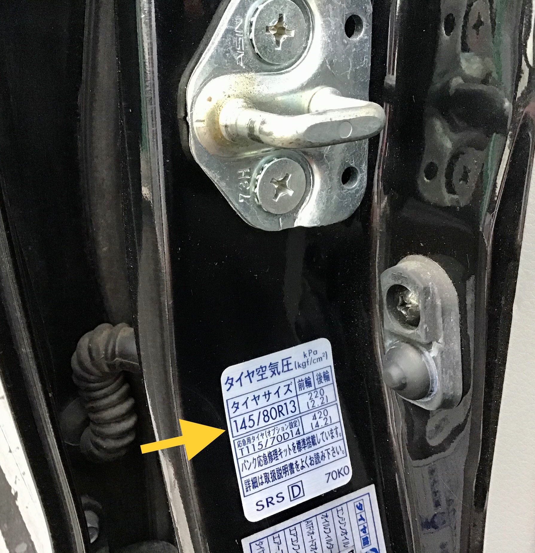 国産車の場合は運転席ドアを開けたところにもタイヤサイズが記載されています。