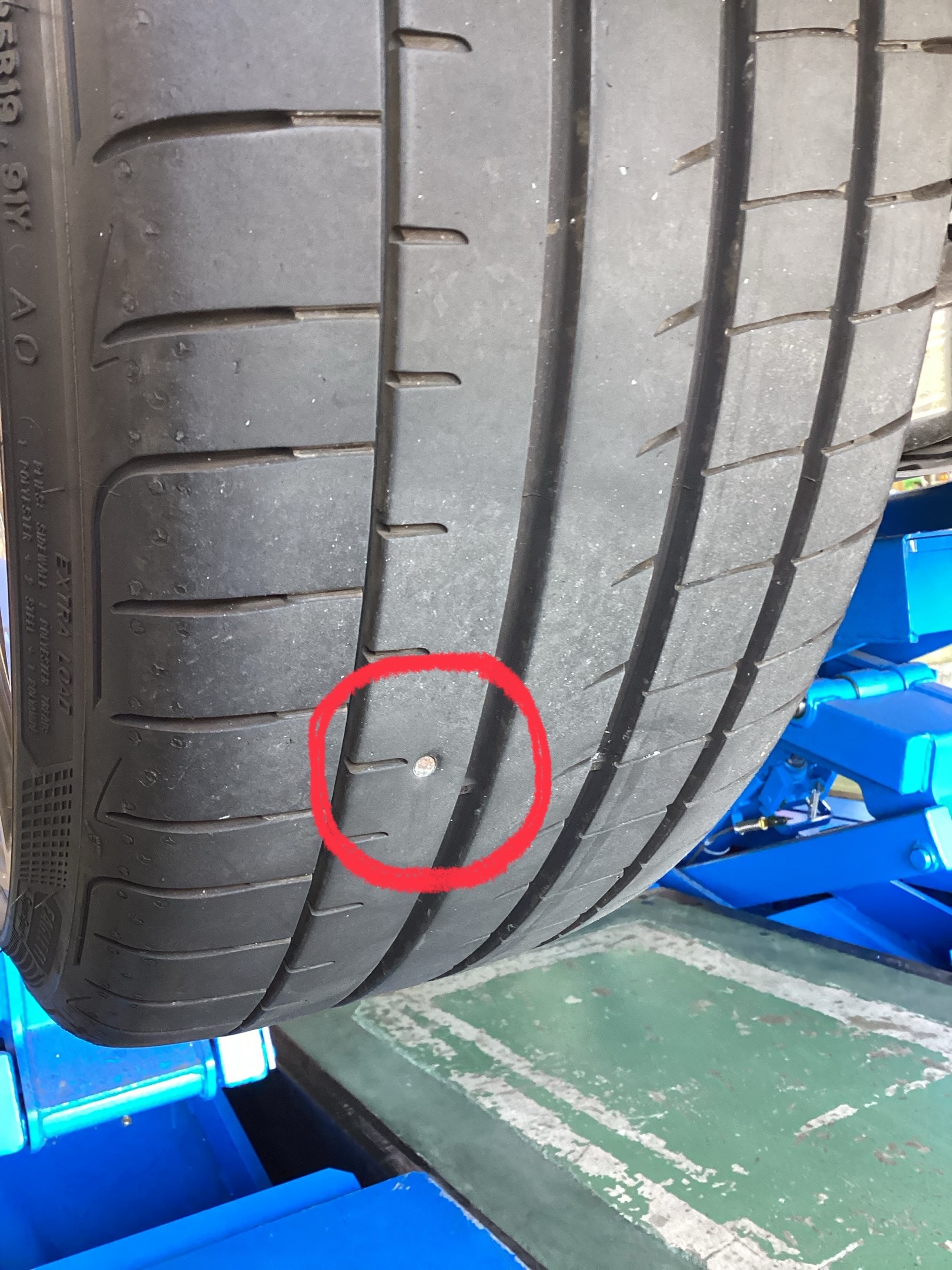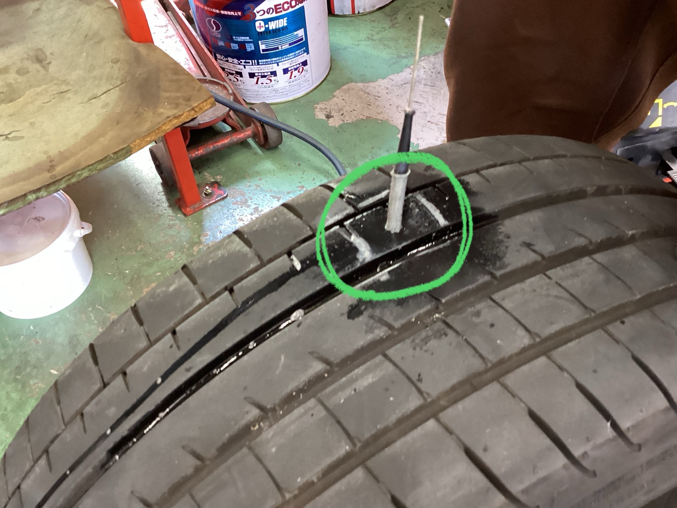 まずはタイヤのパンク箇所を確認し