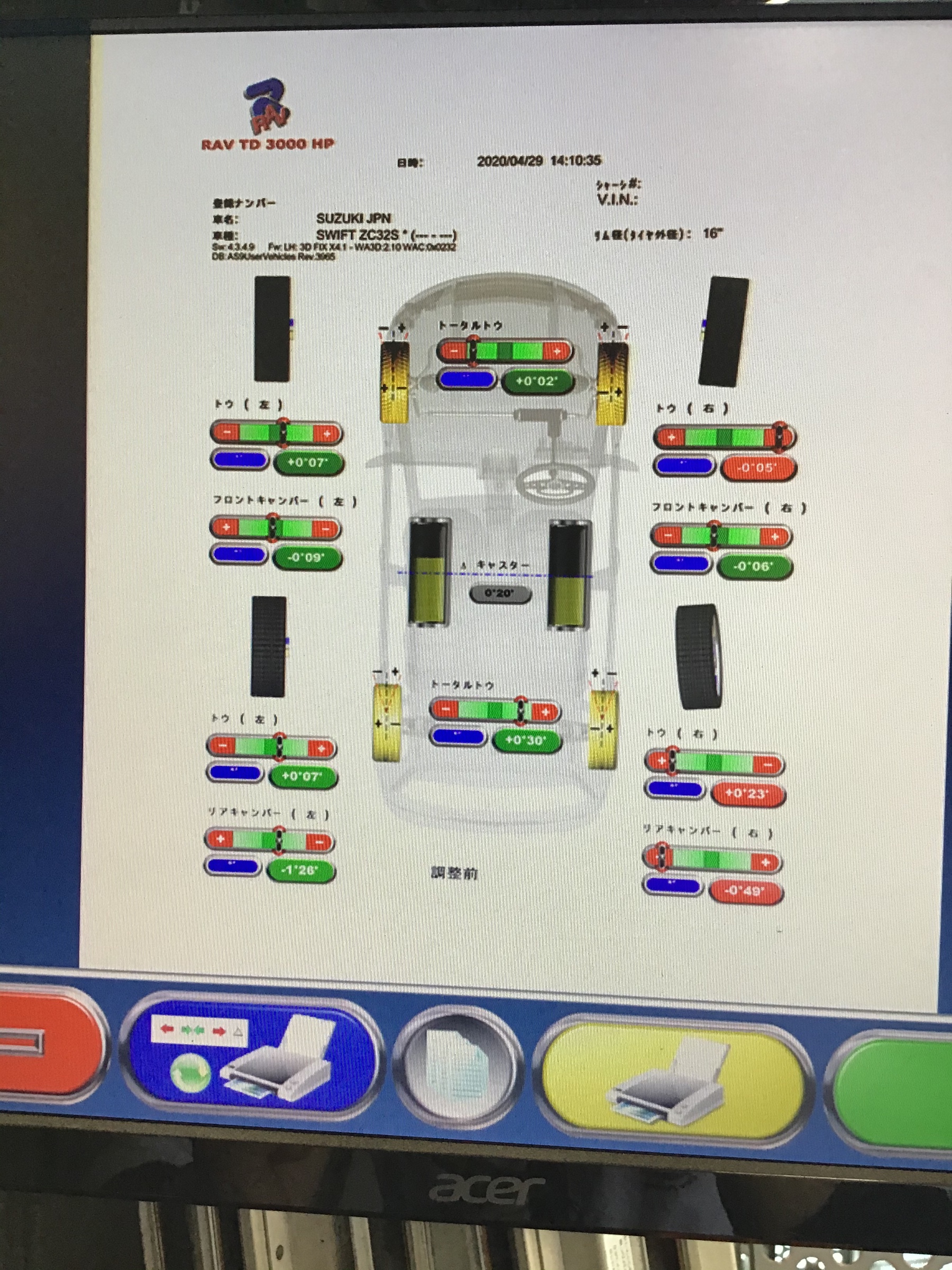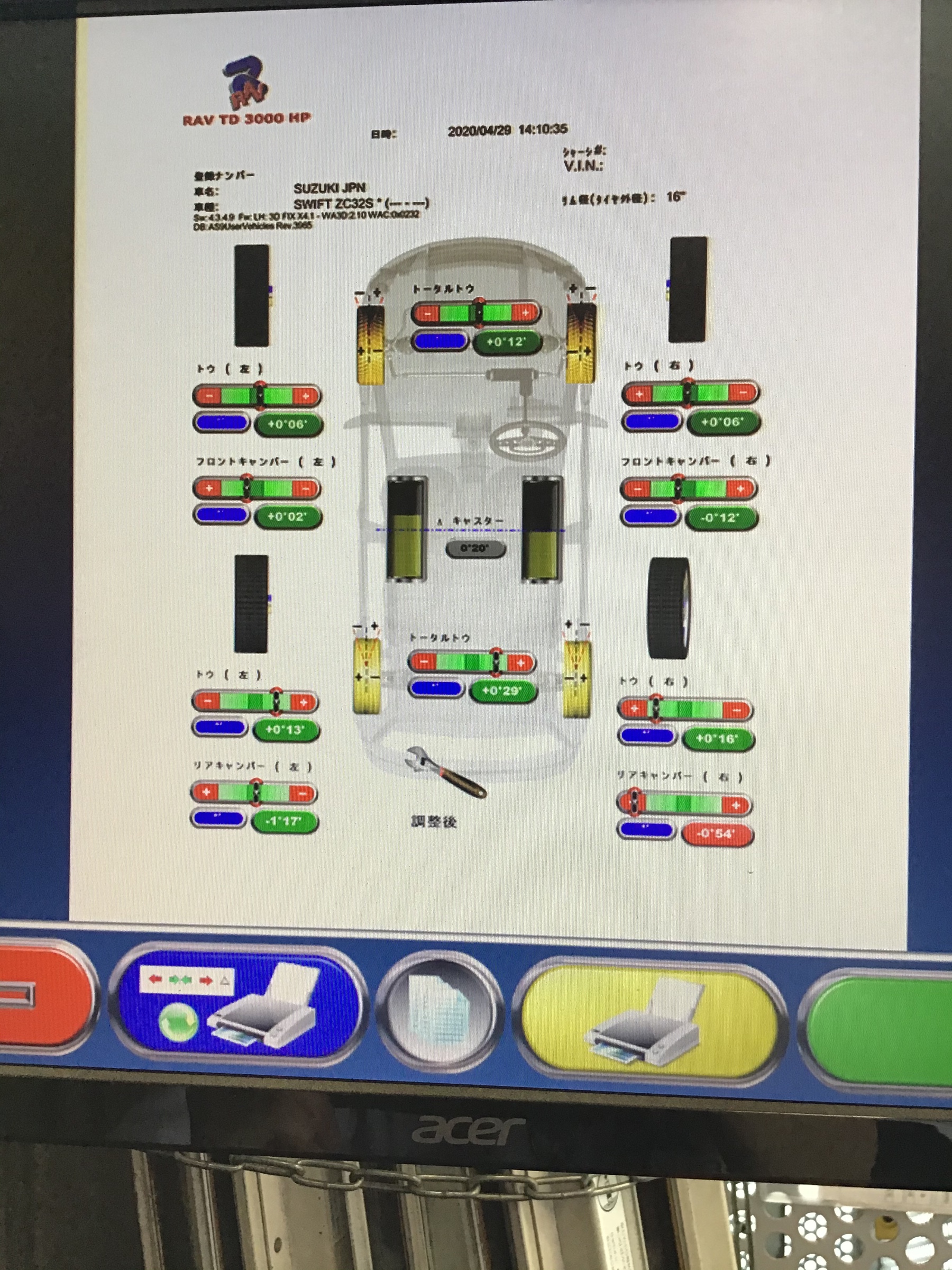 スイフトスポーツは、前後のトゥーの4箇所調整出来るので、そこを基準値内に戻します‼️