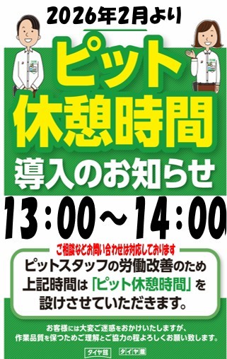 ~お昼休憩導入のご案内~ 2026年2月7日 お客様へお知らせ いつも当店をご利用いただき誠にありがとうございます。 当店ではお客様へ持続的なサービスを行うため、 2026年2月より お昼休憩を導入し、「13:00~14:00までの時間帯」は PITの稼働を一時中断させて頂きます。 10:30~13:00 14:00~19:00 は従来通り営業 お客様のご理解ご協力程、宜しくお願い致します。