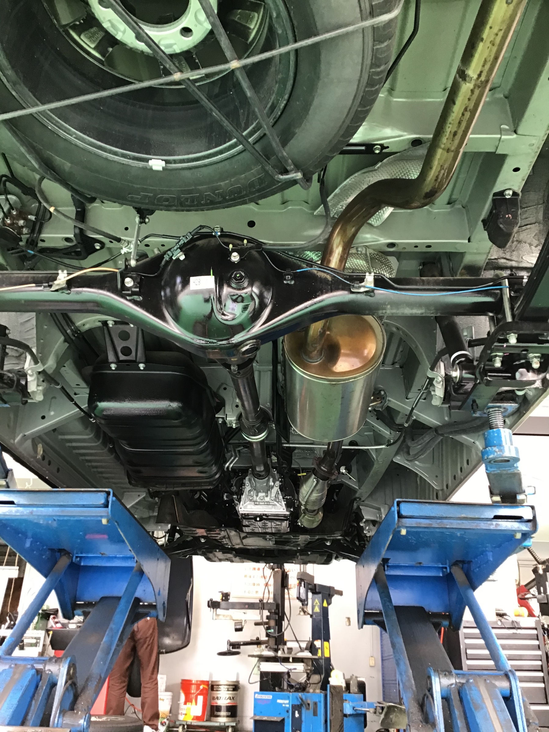 下回りが錆びてしまってマフラーなどに穴が開かないように、下回りの防錆をおこなっております。