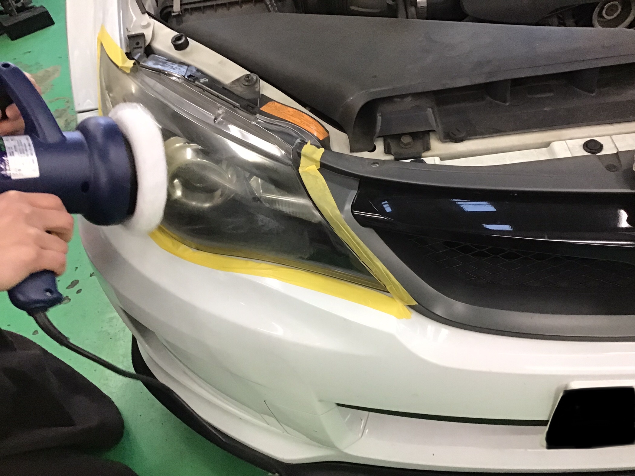 まずヘッドライトの汚れをマイクロファイバークロスで拭き取り、周辺のマスキングを行います。
