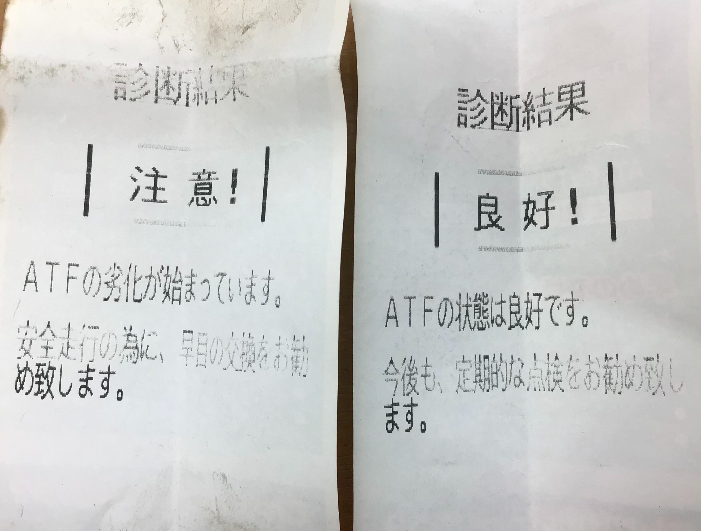 最近の車では出来ないですが、ATFのオイルレベルゲージがある車であれば上の画像のように今のオイルの状態を診断することができます。