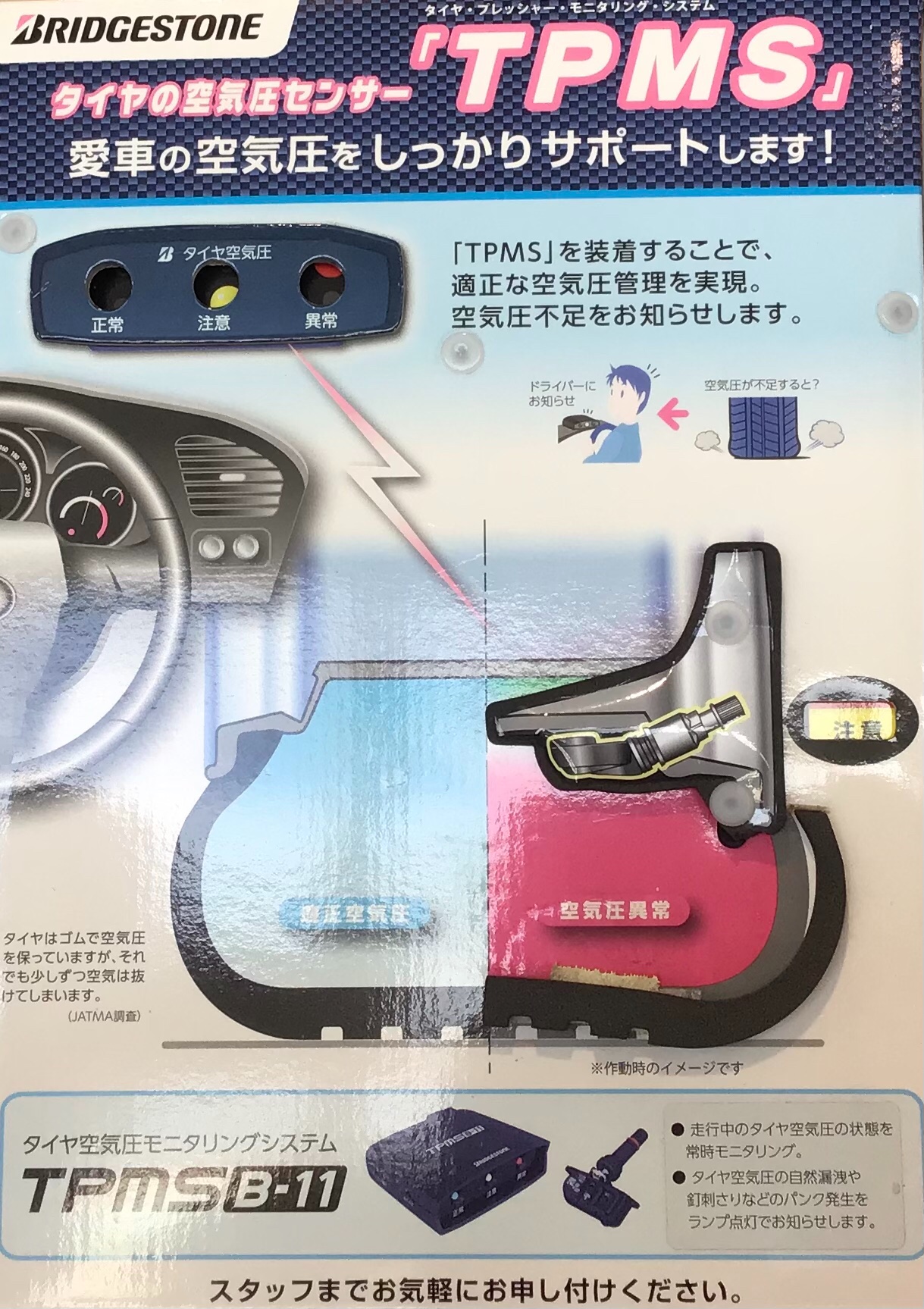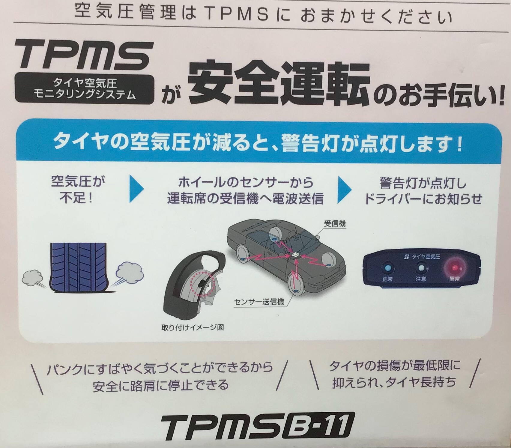 正常、注意、異常の3段階で表示されるので、空気圧の低下、パンクに早く気づけるのですぐにタイヤショップに行けるというのが大きなポイントです!