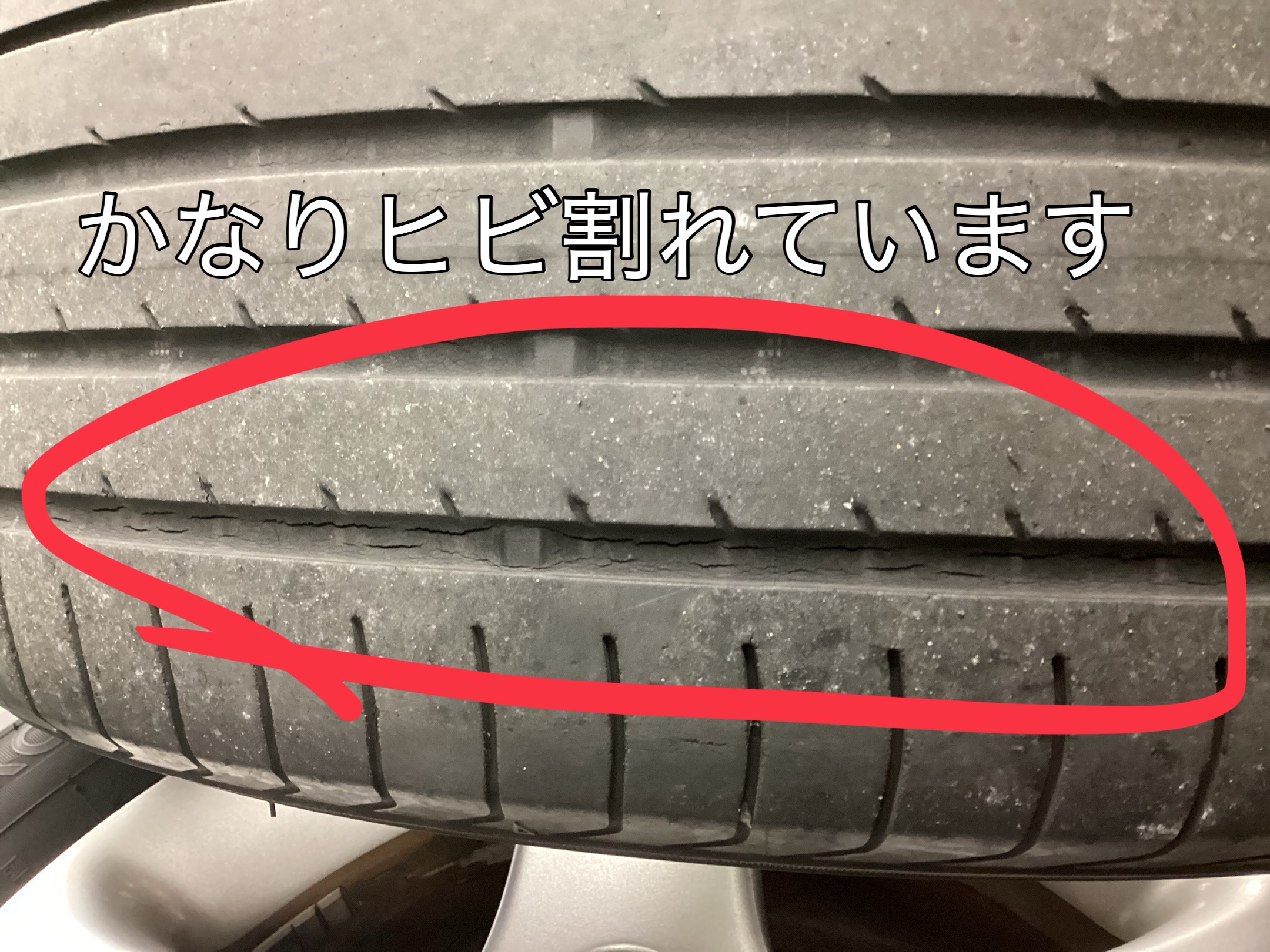 実際に付いていたタイヤを見ますと、ミゾは残っていますがひび割れがかなり進行しているのがわかるかと思います。