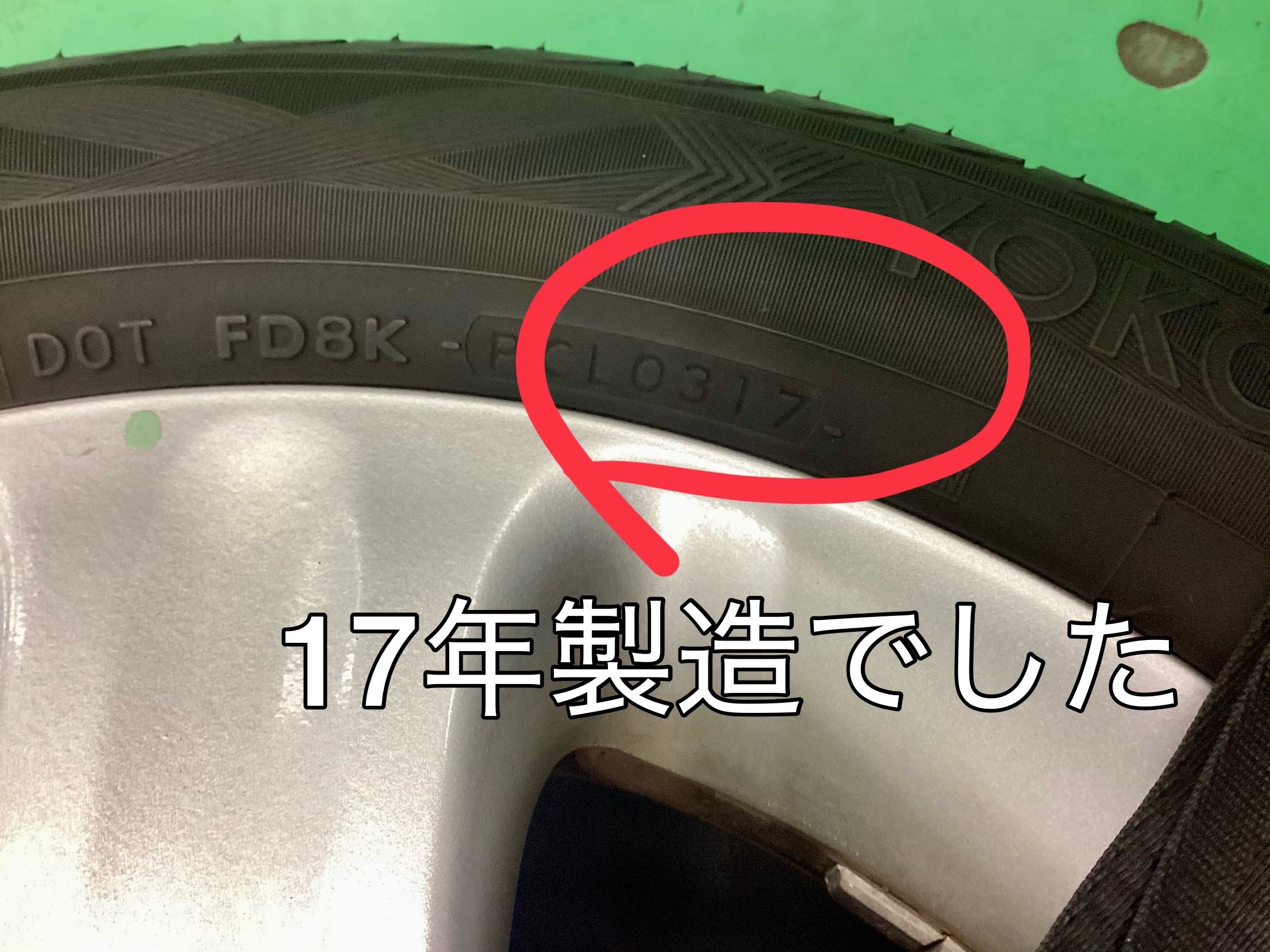 ちなみにセリアルを確認すると17年製造、つまり8年前のタイヤが付いていました。