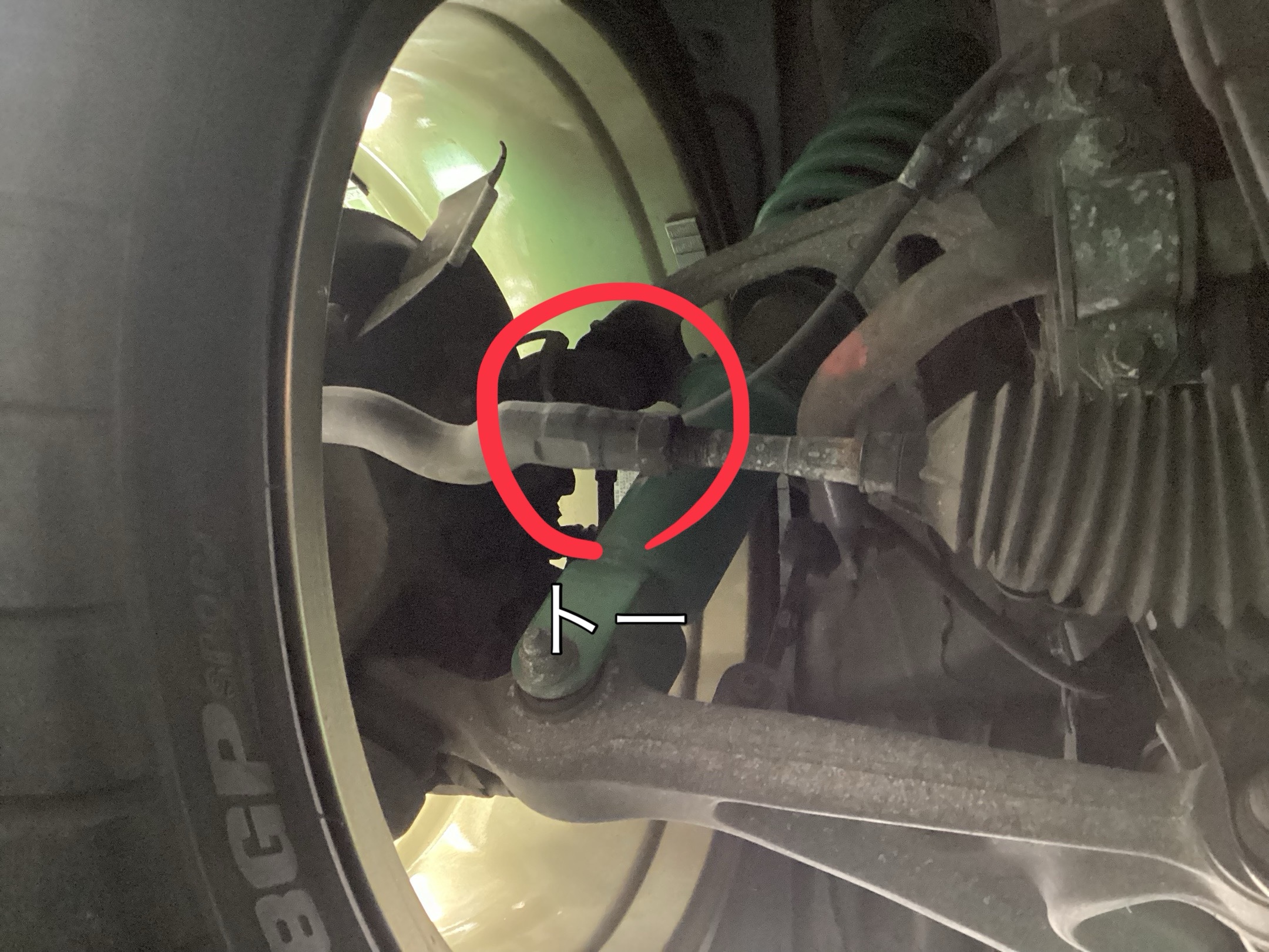 フロントのトーはこちら、タイロッドの部分で調整します。