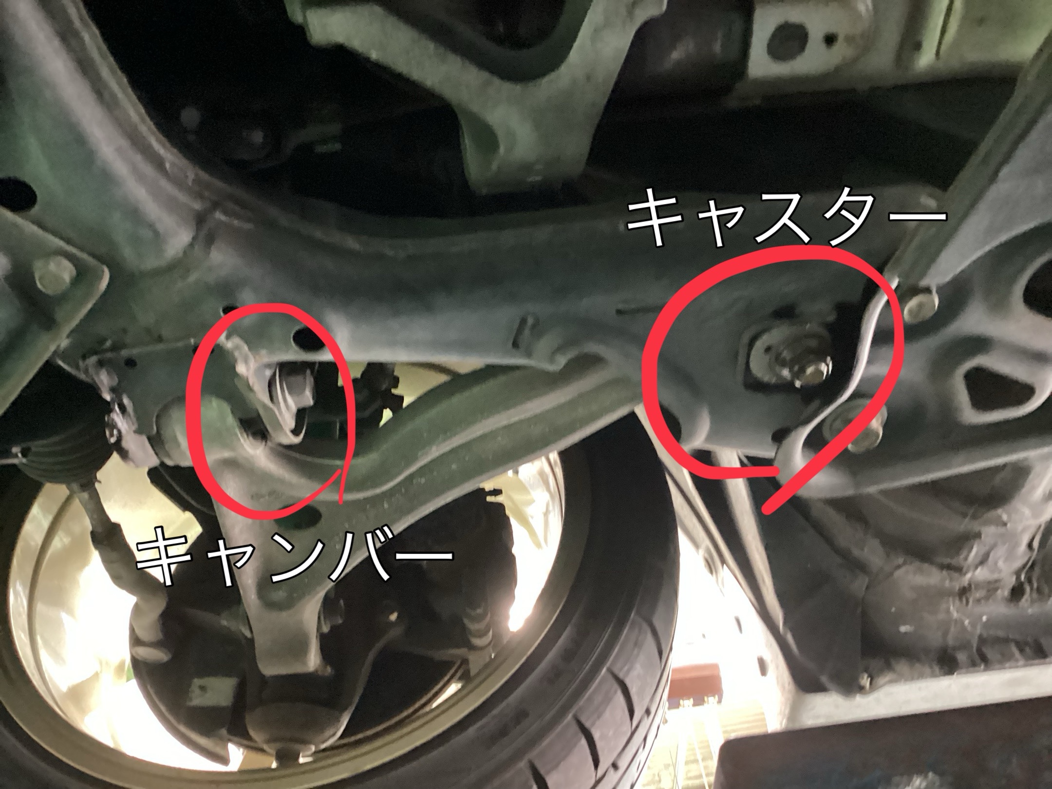 今回はお客様と相談をしリア側はトーを基準値、キャンバーは寝ている左側に合わせます。