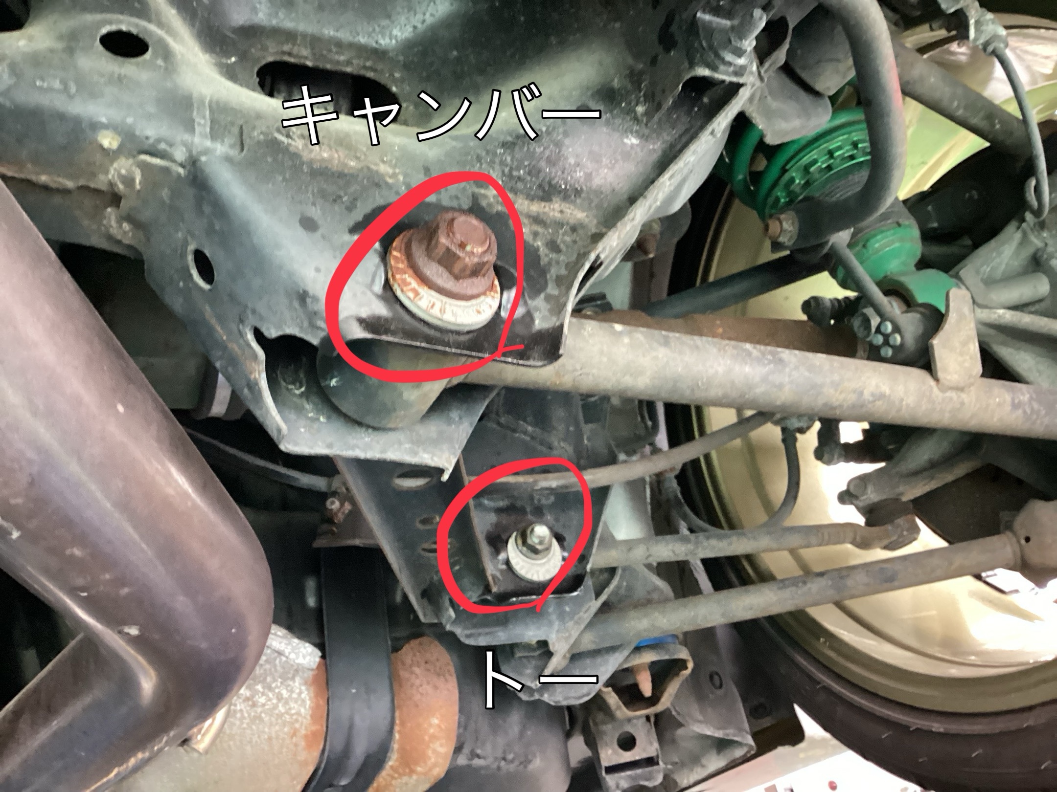 フロントのキャンバー/キャスターです、こちらは偏信カムで調整します