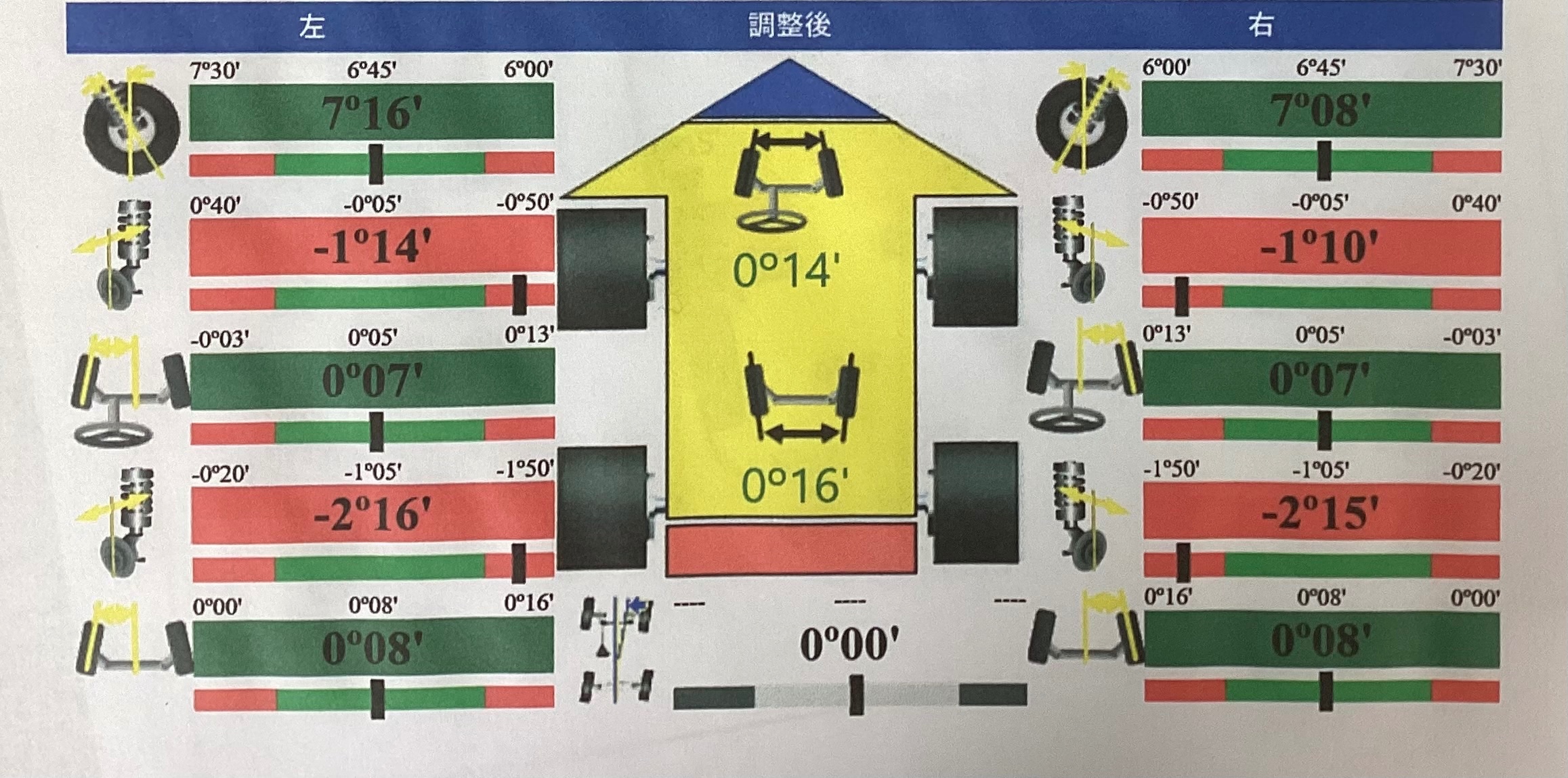 フロントトーは少し内股に設定し、キャンバーは左右それぞれ揃えリアのトーは基準値に調整致しました。