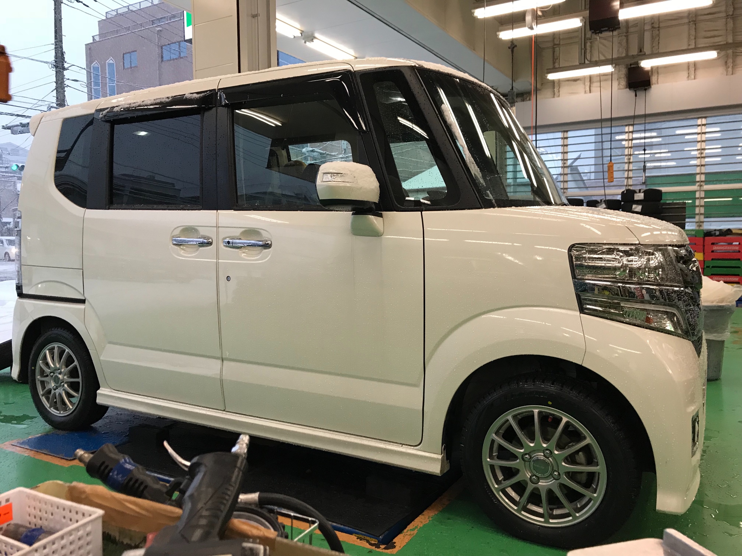 雪の中滑り込みでN-BOXのお客様がスタッドレスとホイールをご購入されていきました。