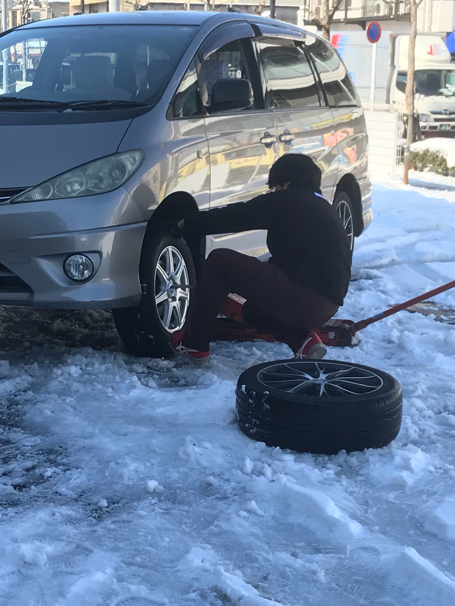 急遽、その場でジャッキアップしてスタッドレスタイヤを装着!