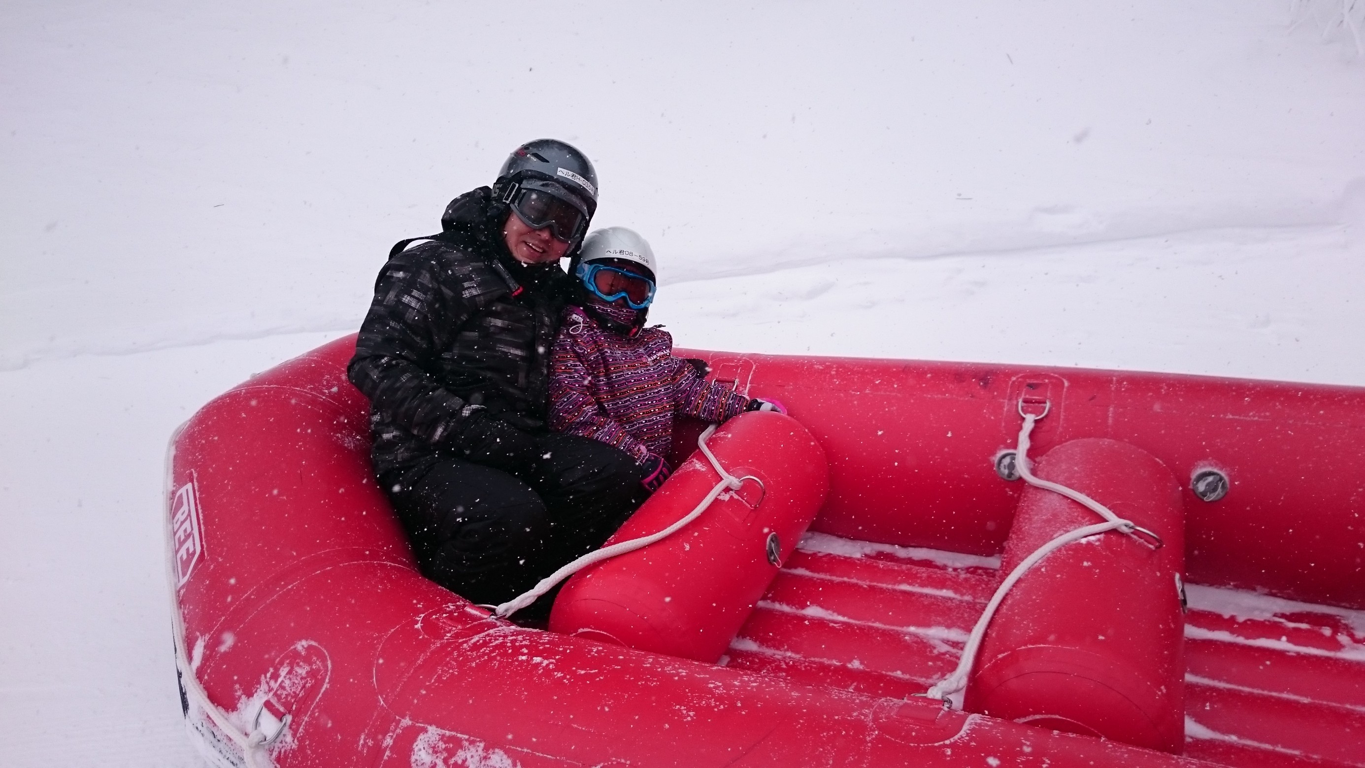 天気は雪が横に降る中でしたが、ソリをしたりラフティングしたり、娘達は初めてのスキー場を楽しんでました。