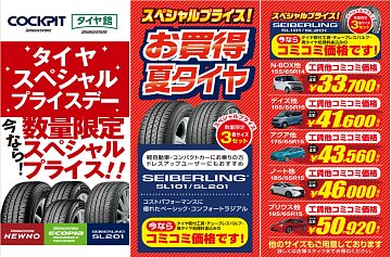 記事一覧 期間限定!『タイヤスペシャルプライスデー』開催!! こんにちは、いつもタイヤ館足立店をご利用いただきましてありがとうございます。 4/17より、コクピット・タイヤ館におきまして、 期間限定! サイズ限定!! 数量限定!!! お得にお買い求めいただける、「タイヤスペシャルプライスデー」がスタートします! タイヤスペシャルプライスデー今なら... 2026年4月14日 ポスト