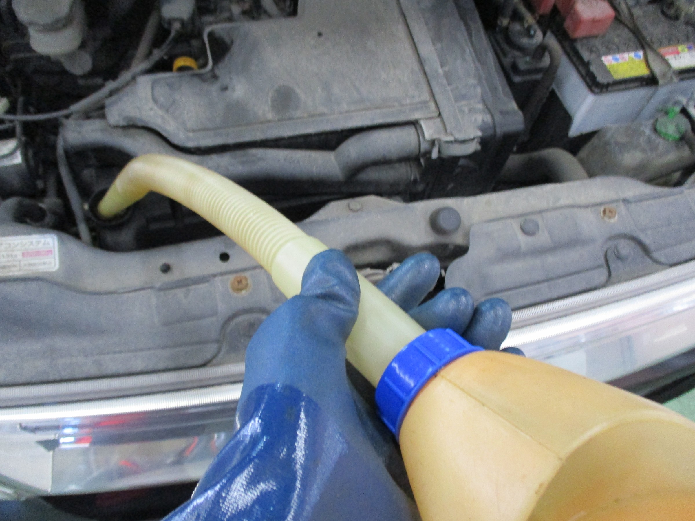 ゲージでオイル量を確認しながら新しいオイルを入れます