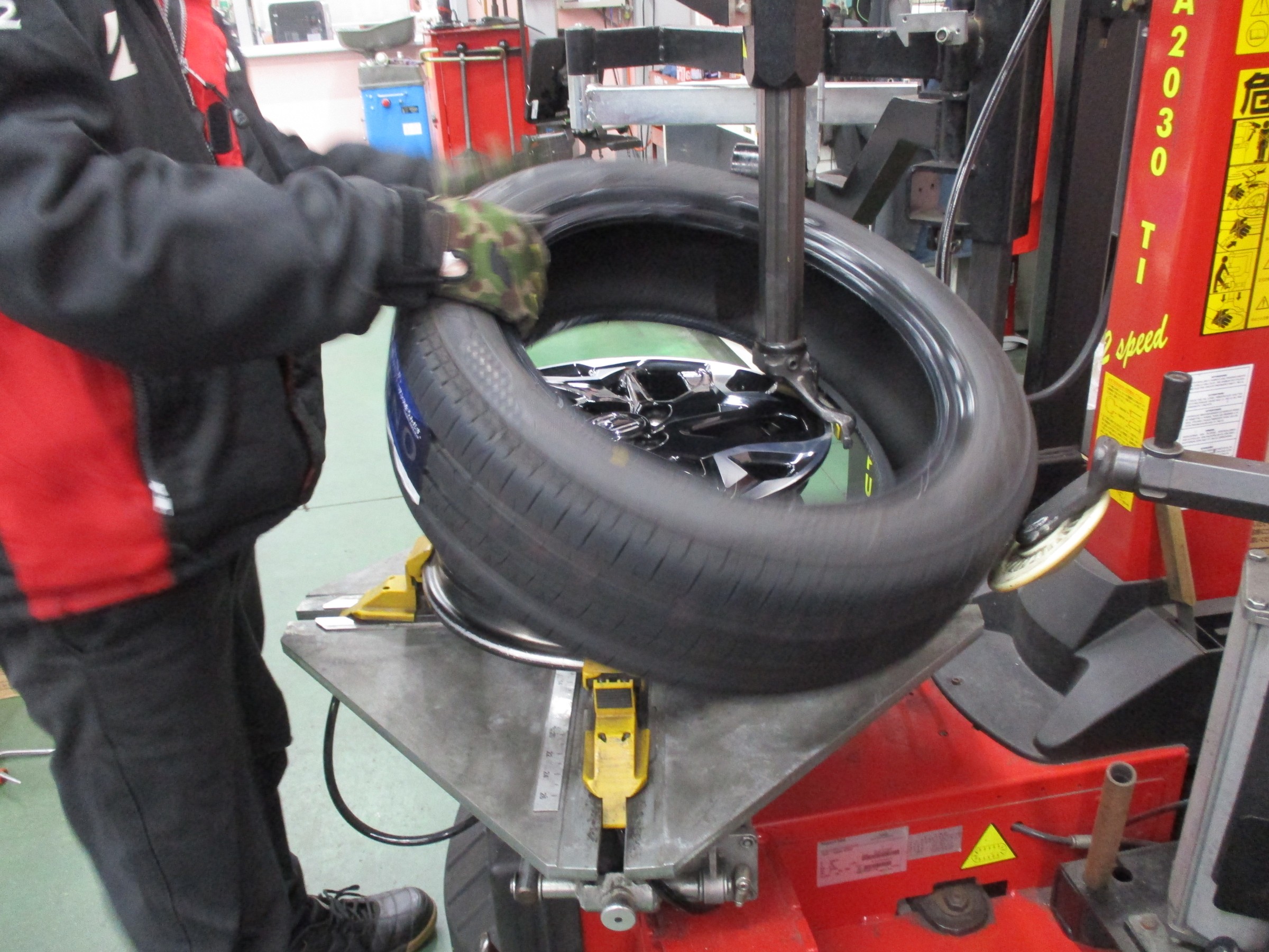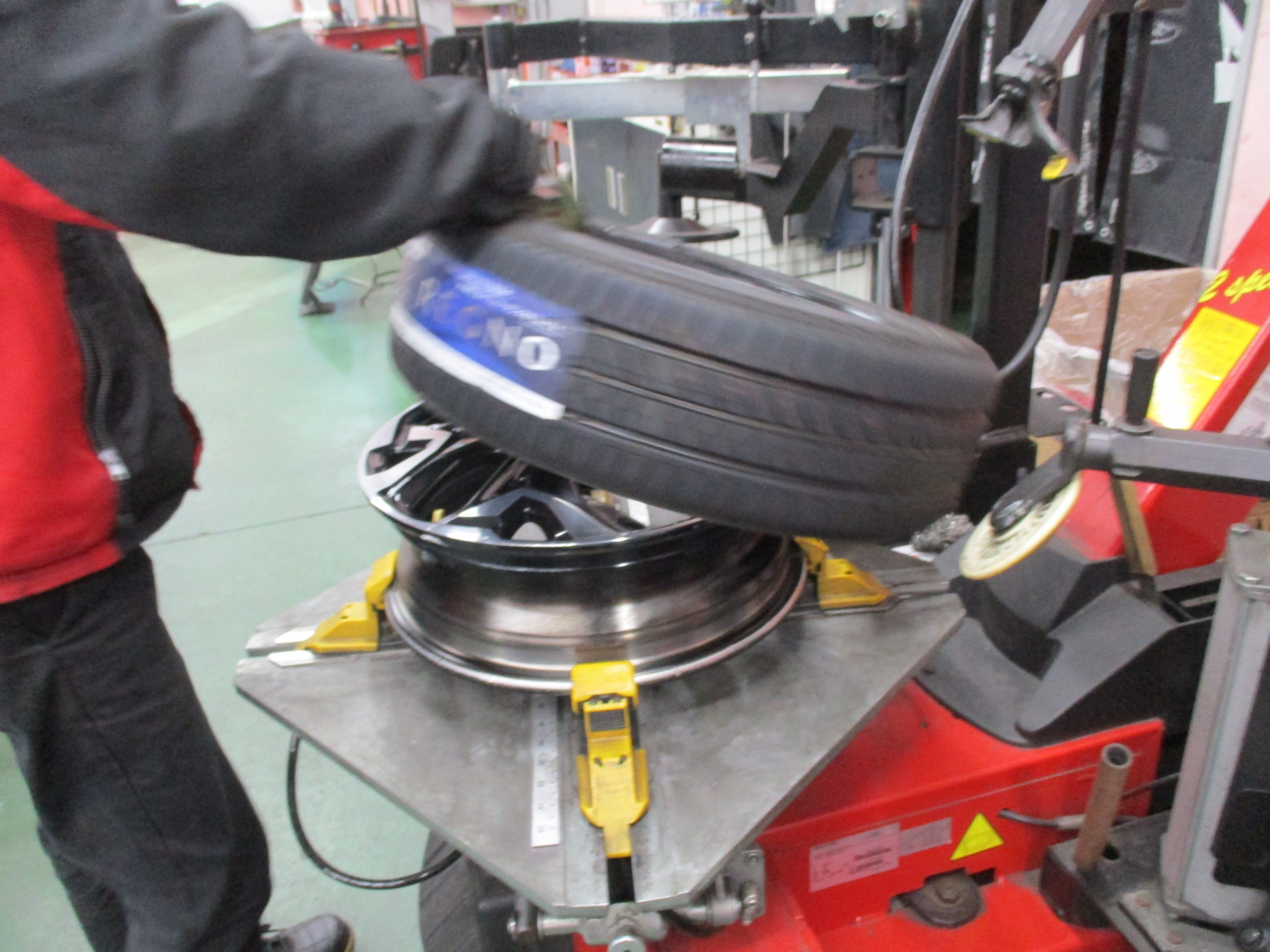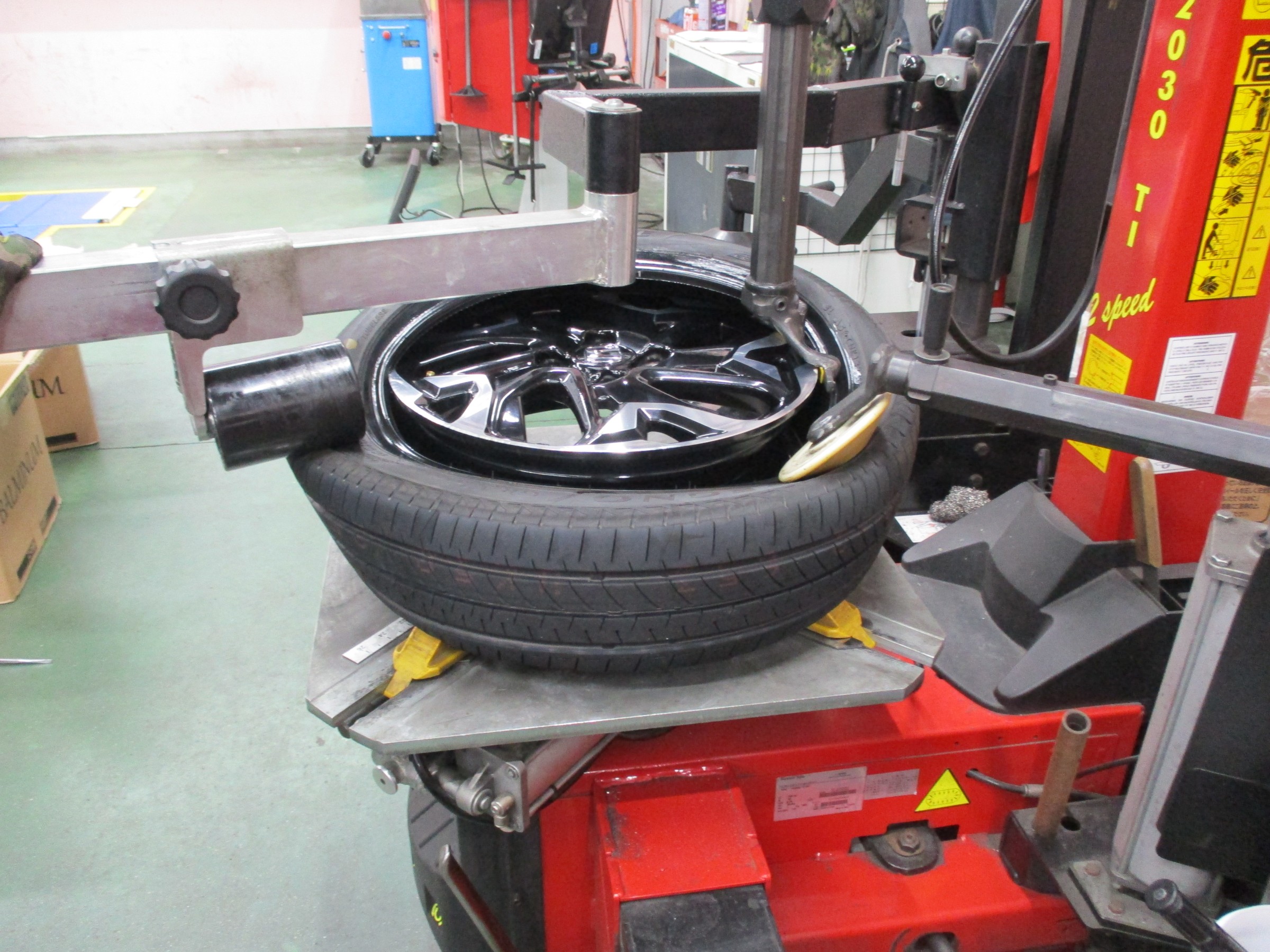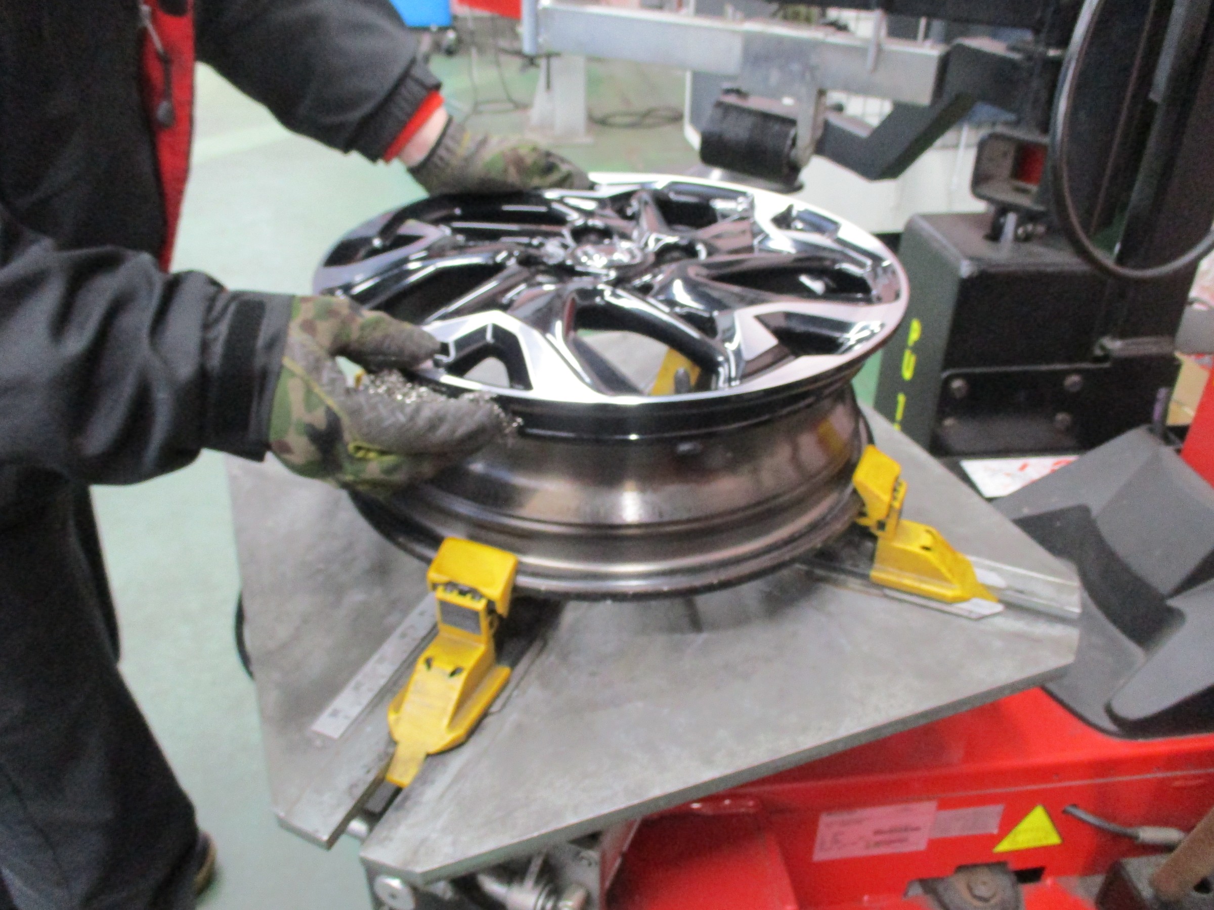 レバーを使用し、ホイールにキズが付かない様に作業しています