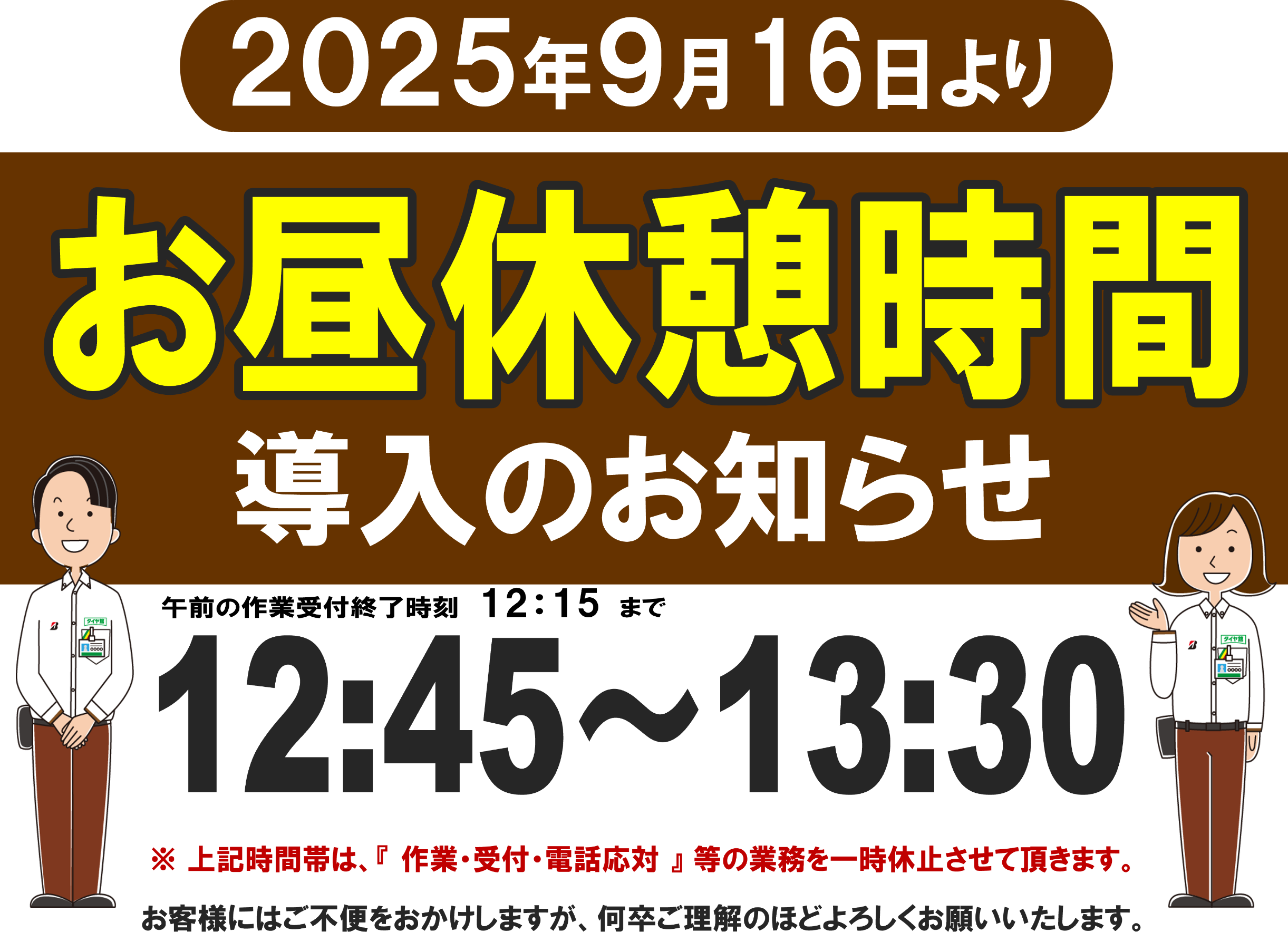 ~昼休憩時間導入のご案内~ 2025年8月26日 日頃よりタイヤ館上尾店をご利用頂きありがとうございます。 この度、スタッフの働きやすい環境づくりとサービス品質向上のため 昼休憩時間を設けさせて頂く事となりました。 導入開始 2025年9月16日より 休憩時間 12:45~13:30 上記の時間帯は、作業、商談、電話などの対応を 一時休止させて頂きます。 皆様にはご不便をおかけ致しますが 何卒ご理解とご協力のほど宜しくお願い致します。