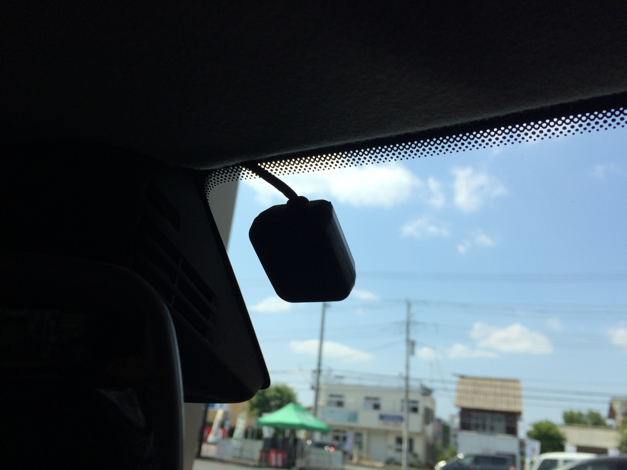 ↓GPS付きスピーカー内蔵アンテナ。フロントガラスの上部に取付。
