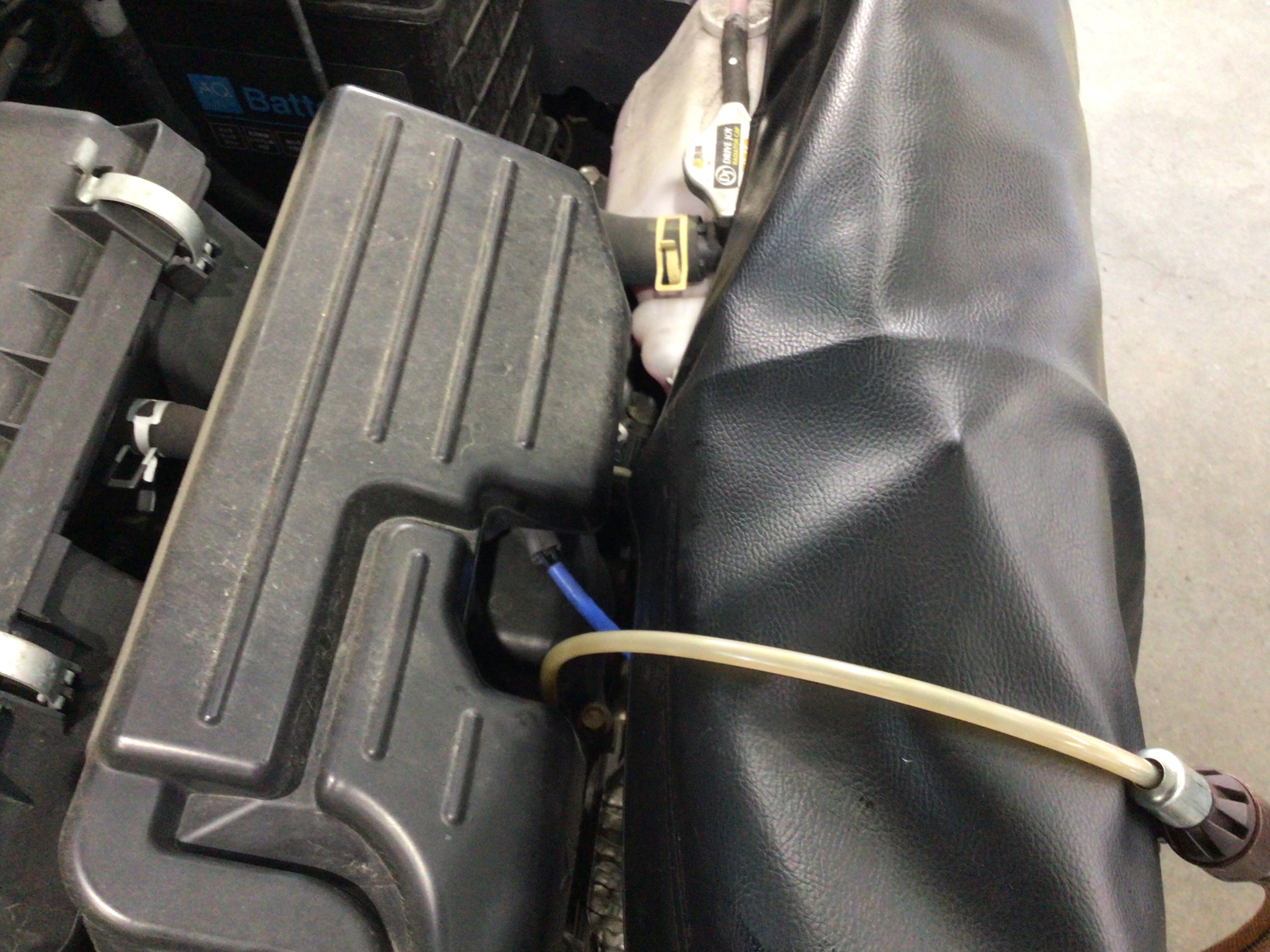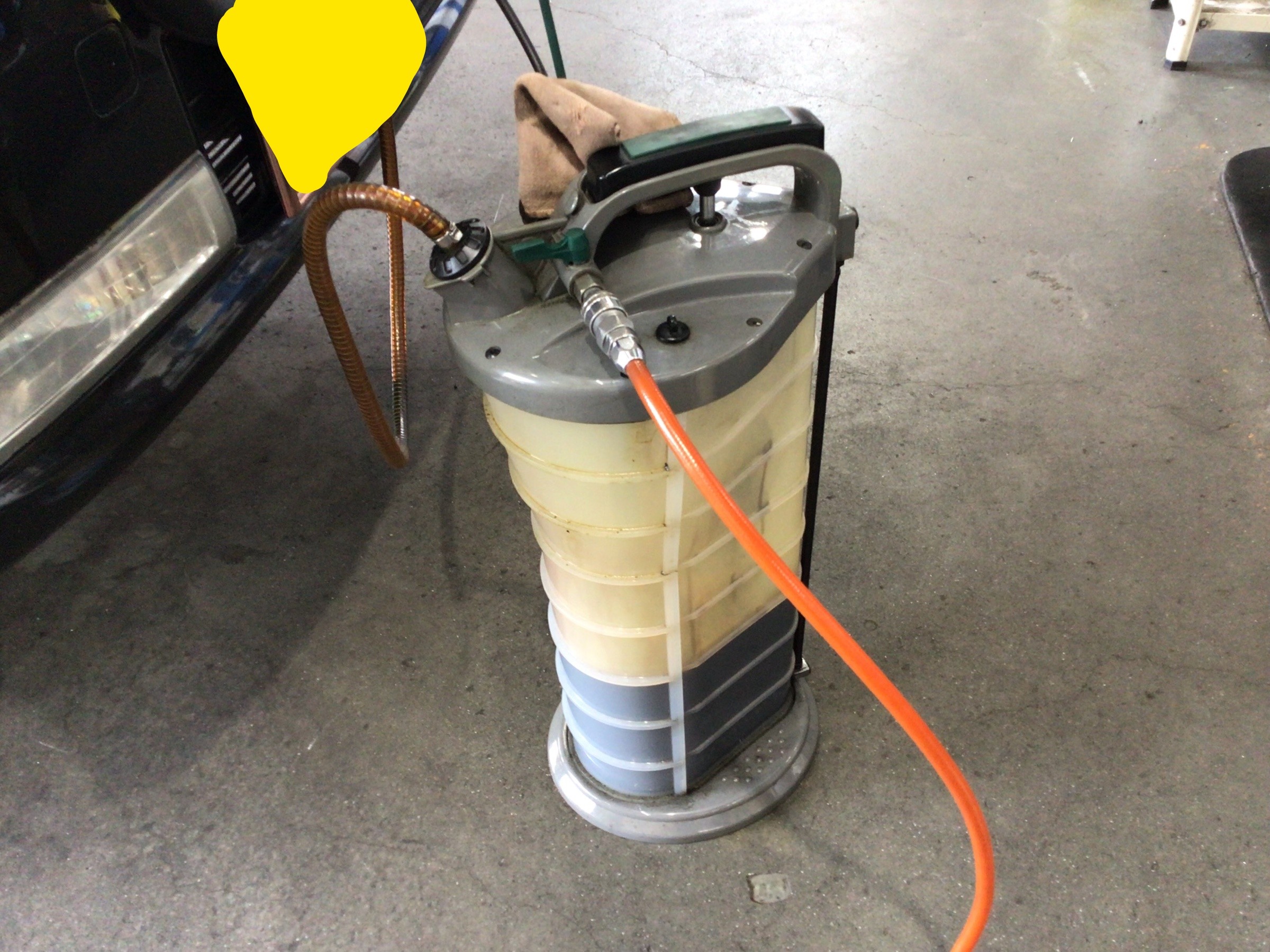 ↑まずは、汚れたエンジンオイルを抜き取ります。今回は上抜きの機械を使い、レベルゲージからから抜き取ります。