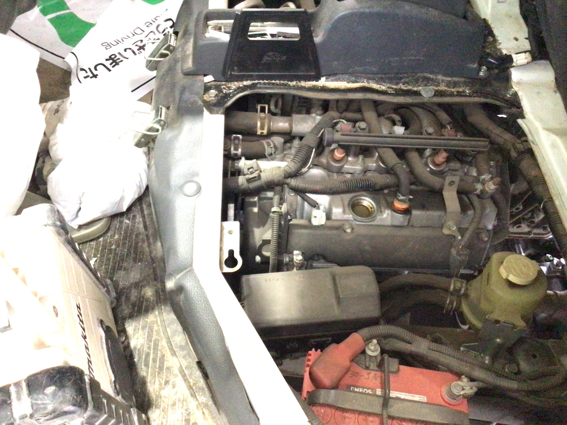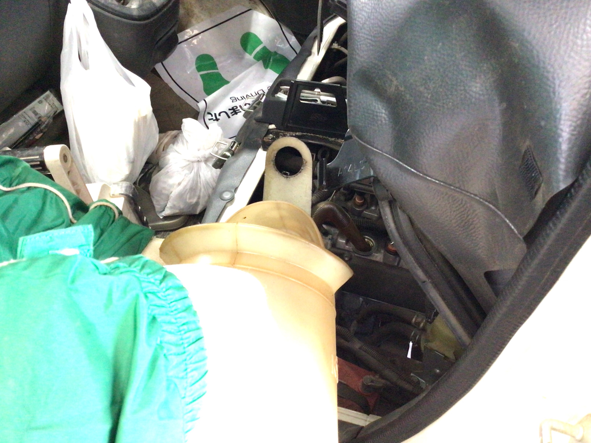 ↑助手席下から新しいエンジンオイルを注入します。