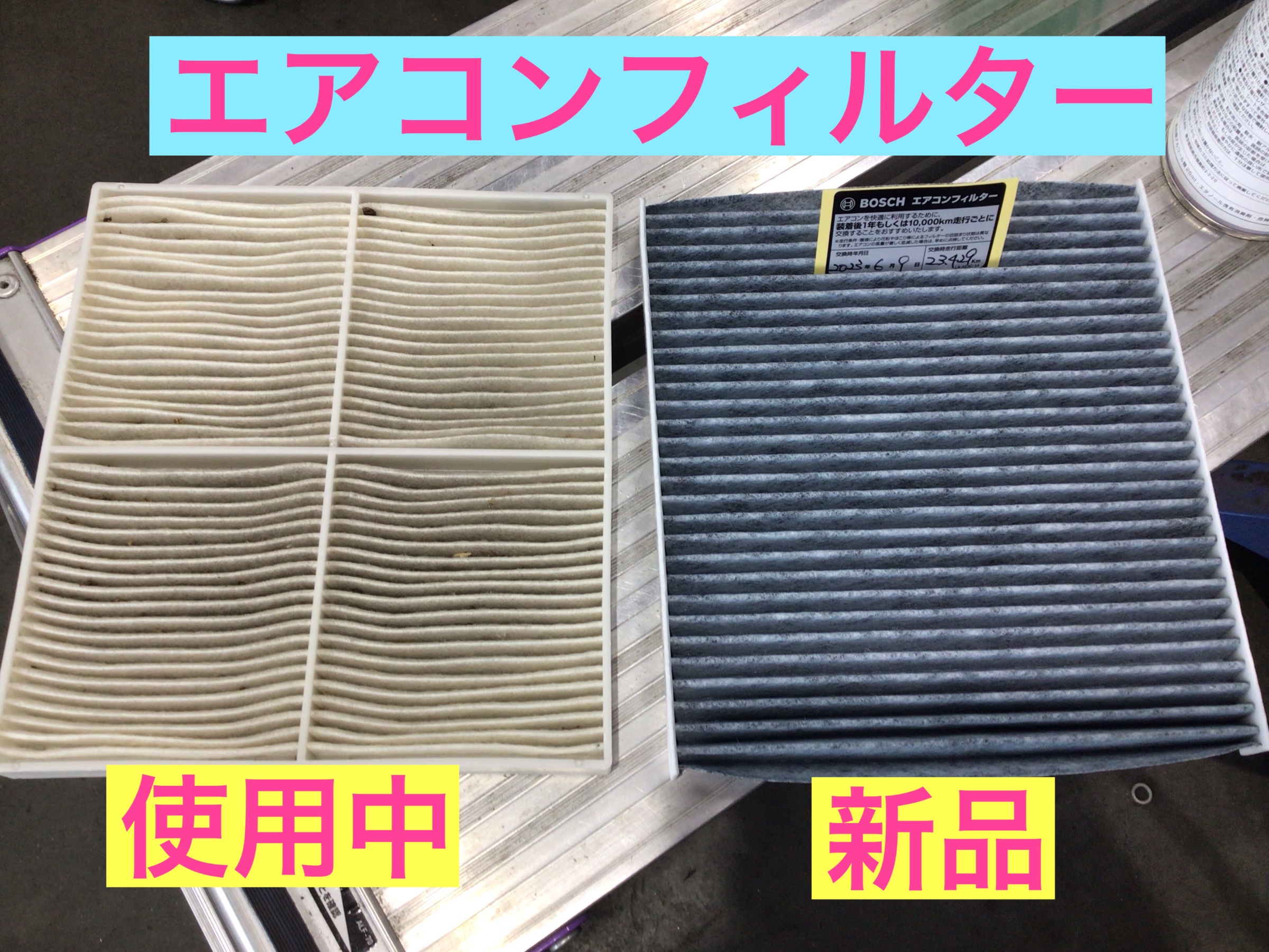 右が新品のエアコンフィルター、そして左が使い古したもの。