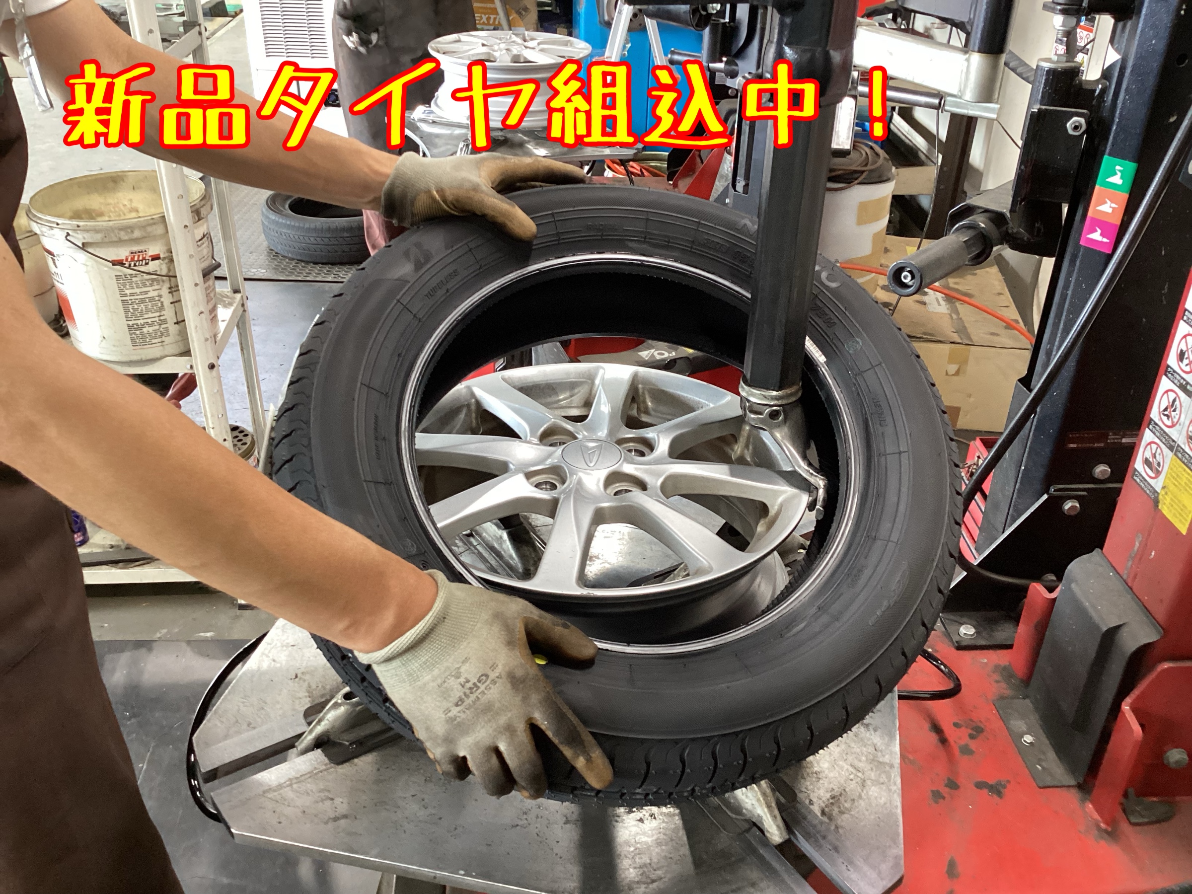 ↑作業中の写真です。タイヤを組み込んだら、ホイールバランスを調整します。