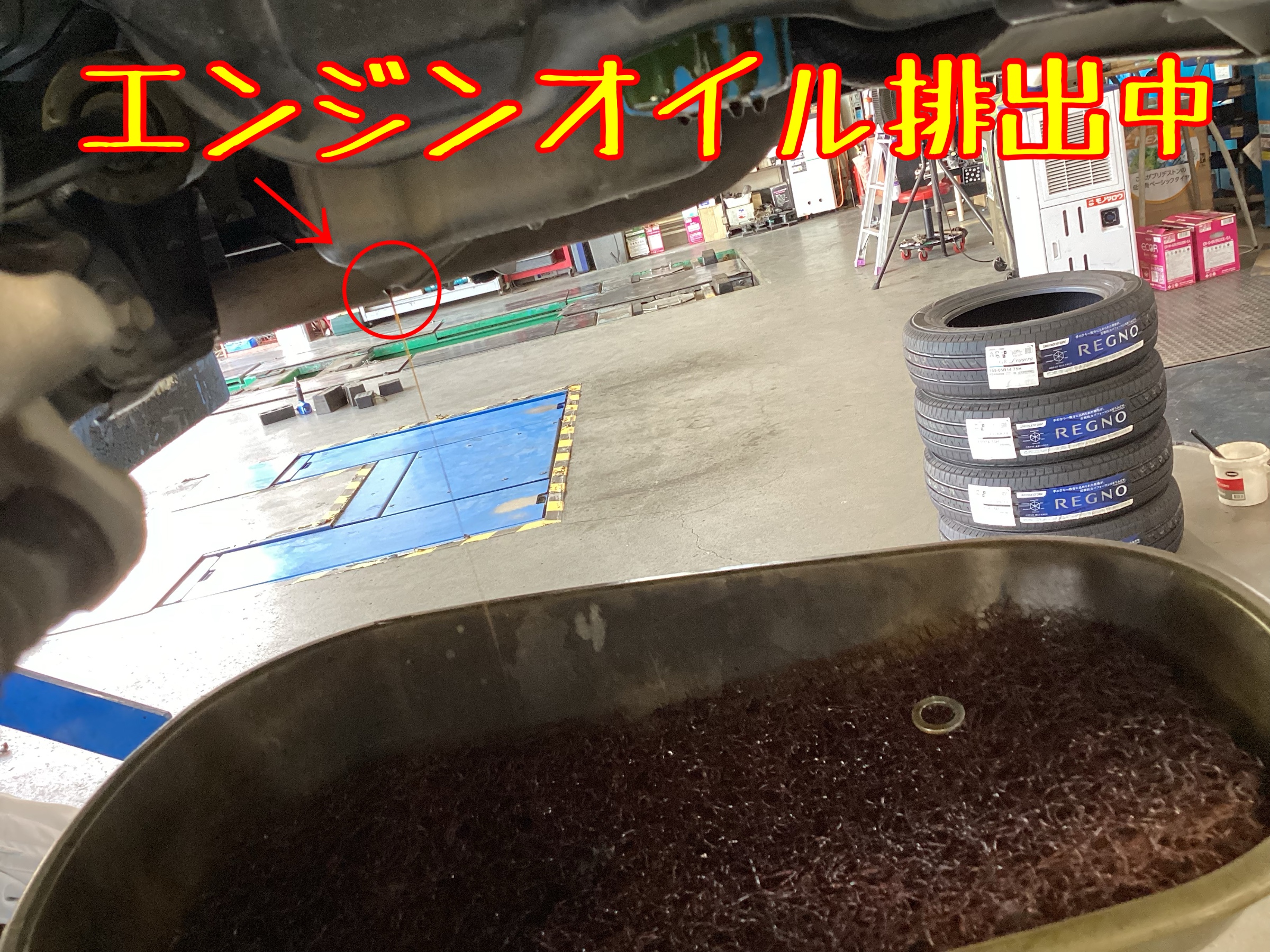 ↑作業中の写真です。車体下部よりエンジンオイル排出中です。