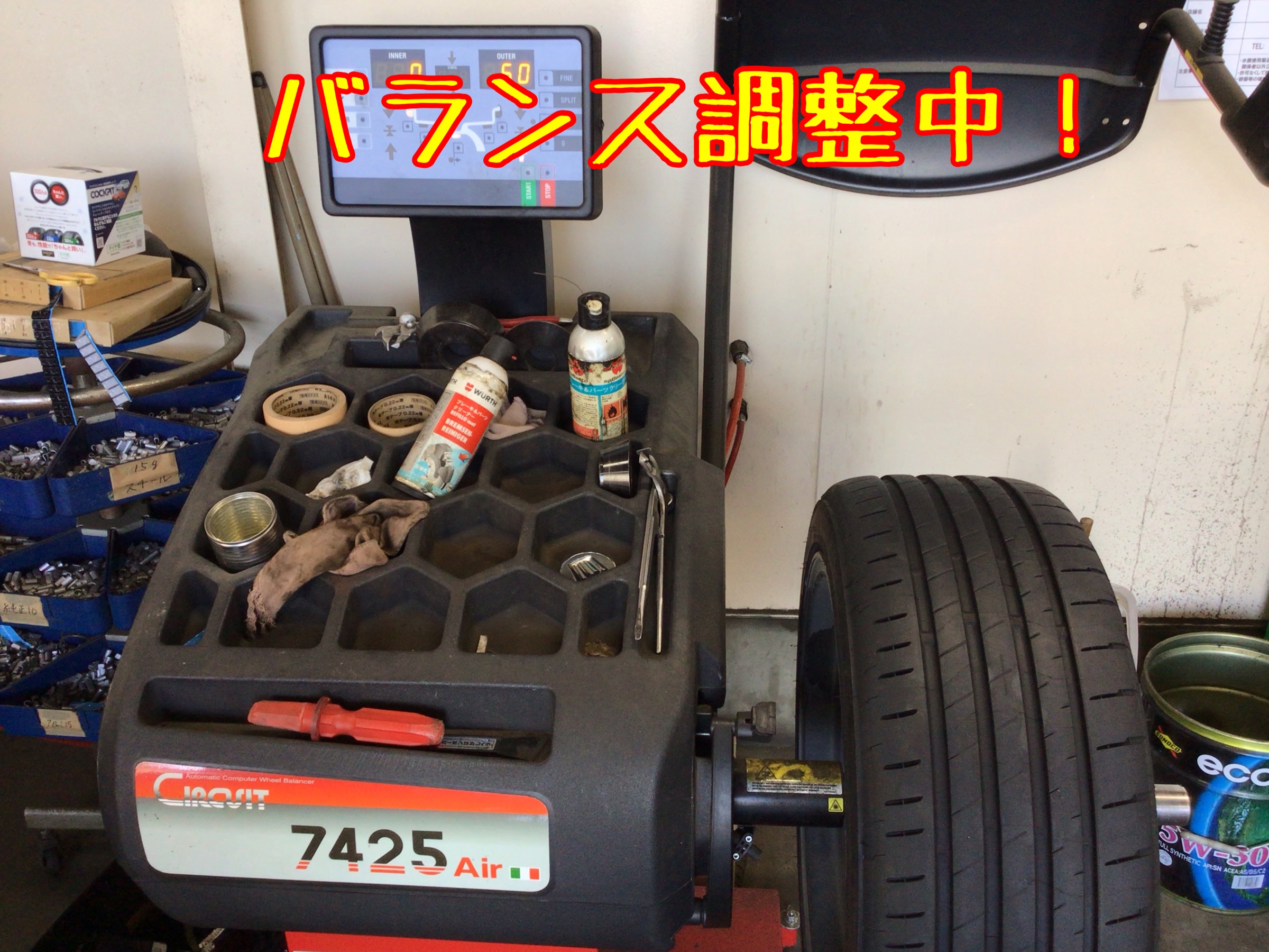 ↑作業中の写真です。タイヤを組み込んだら、ホイールバランスを調整します。