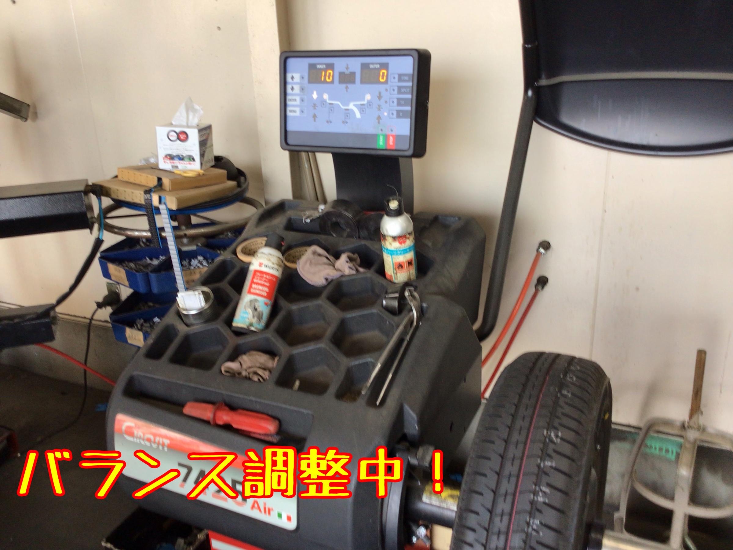 ↑作業中の写真です。タイヤを組み込んだら、ホイールバランスを調整します。