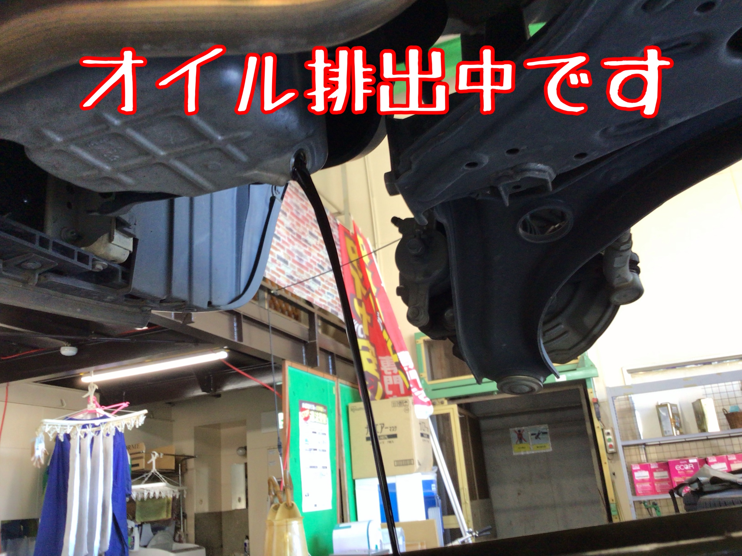 ↑作業中の写真です。車体下部よりエンジンオイルを抜き取ります。