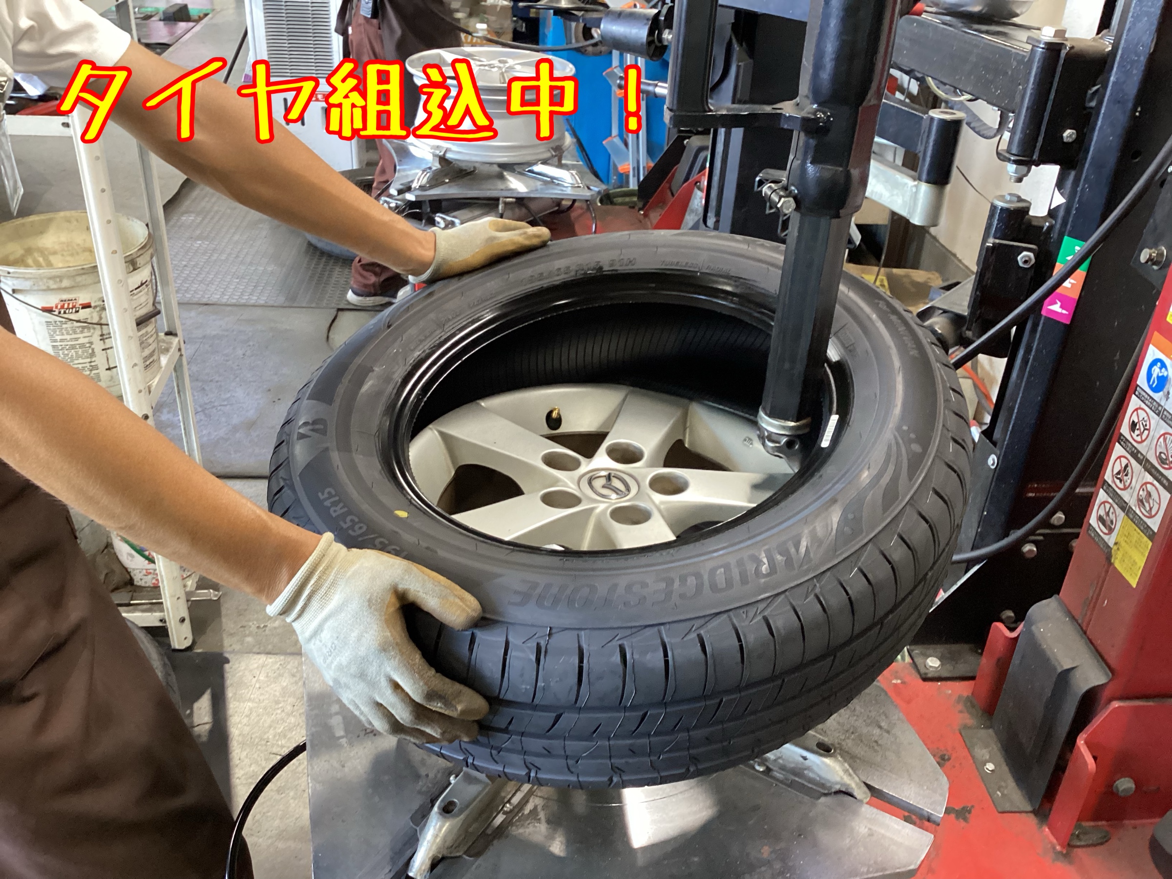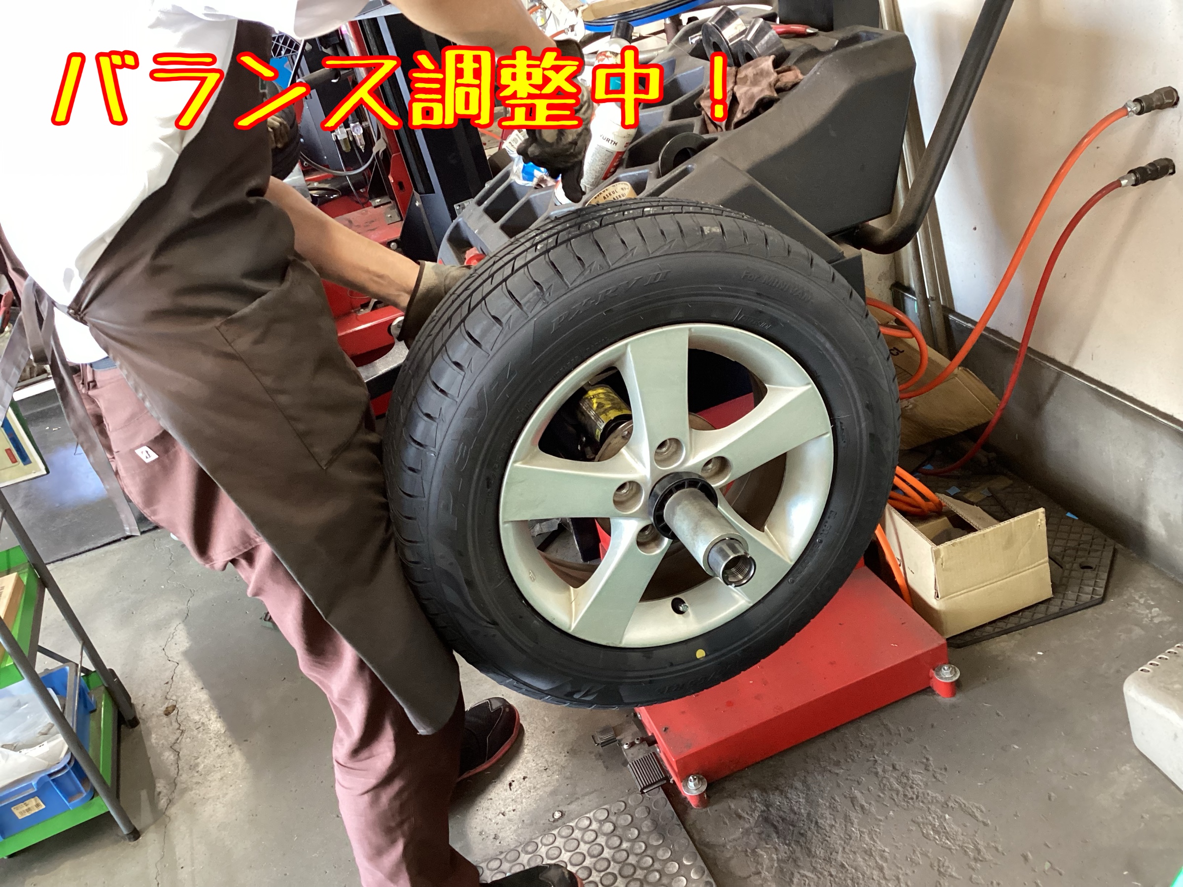 ↑作業中の写真です。タイヤを組み込んだら、ホイールバランスを調整します。
