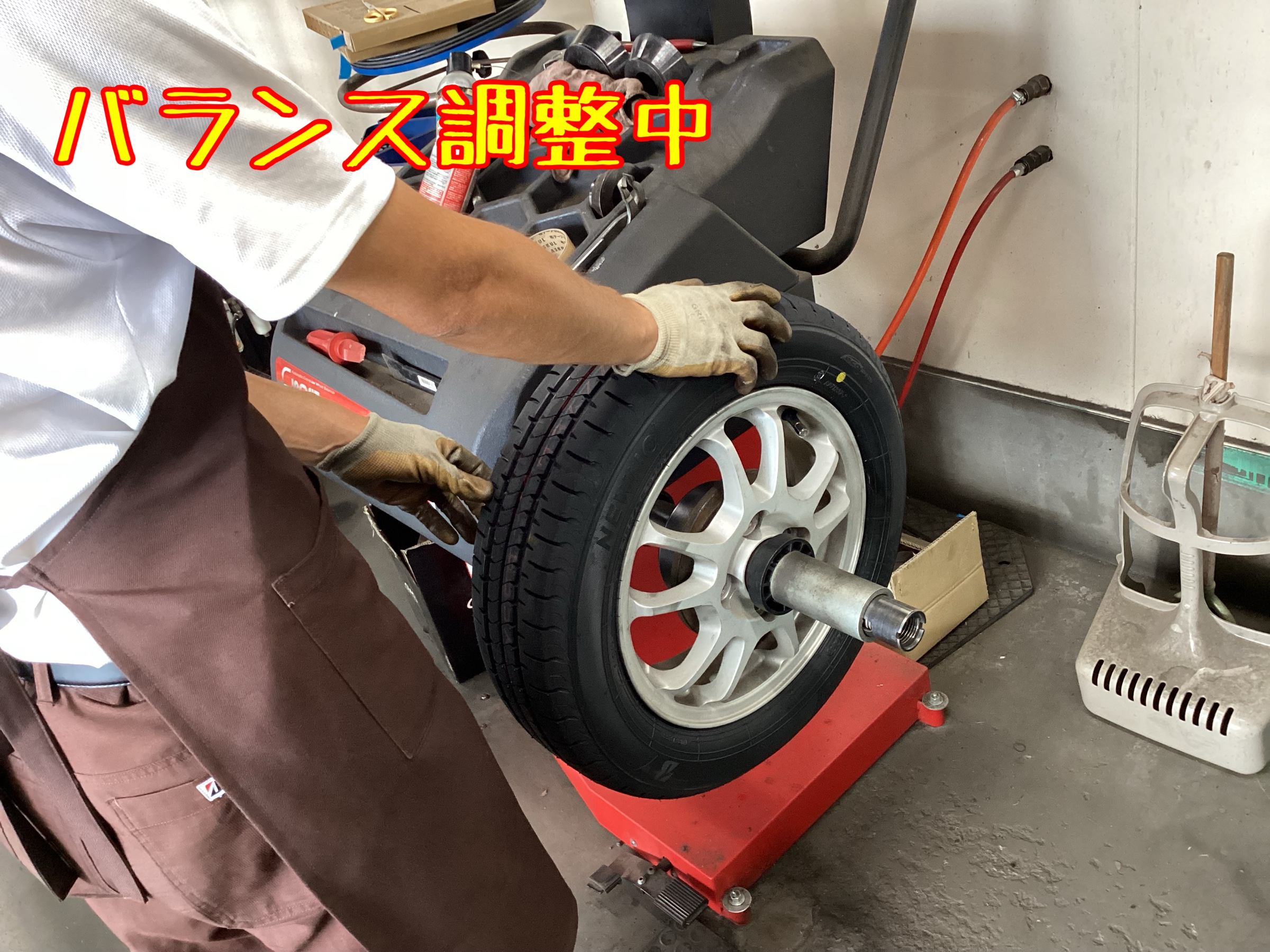 ↑作業中の写真です。タイヤを組み込んだら、ホイールバランスを調整します。