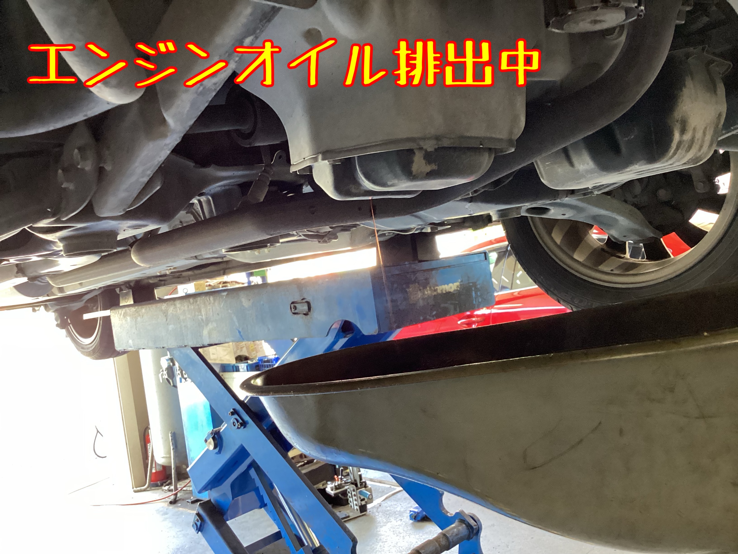 ↑作業中の写真です。車体下部より、エンジンオイルを排出します。