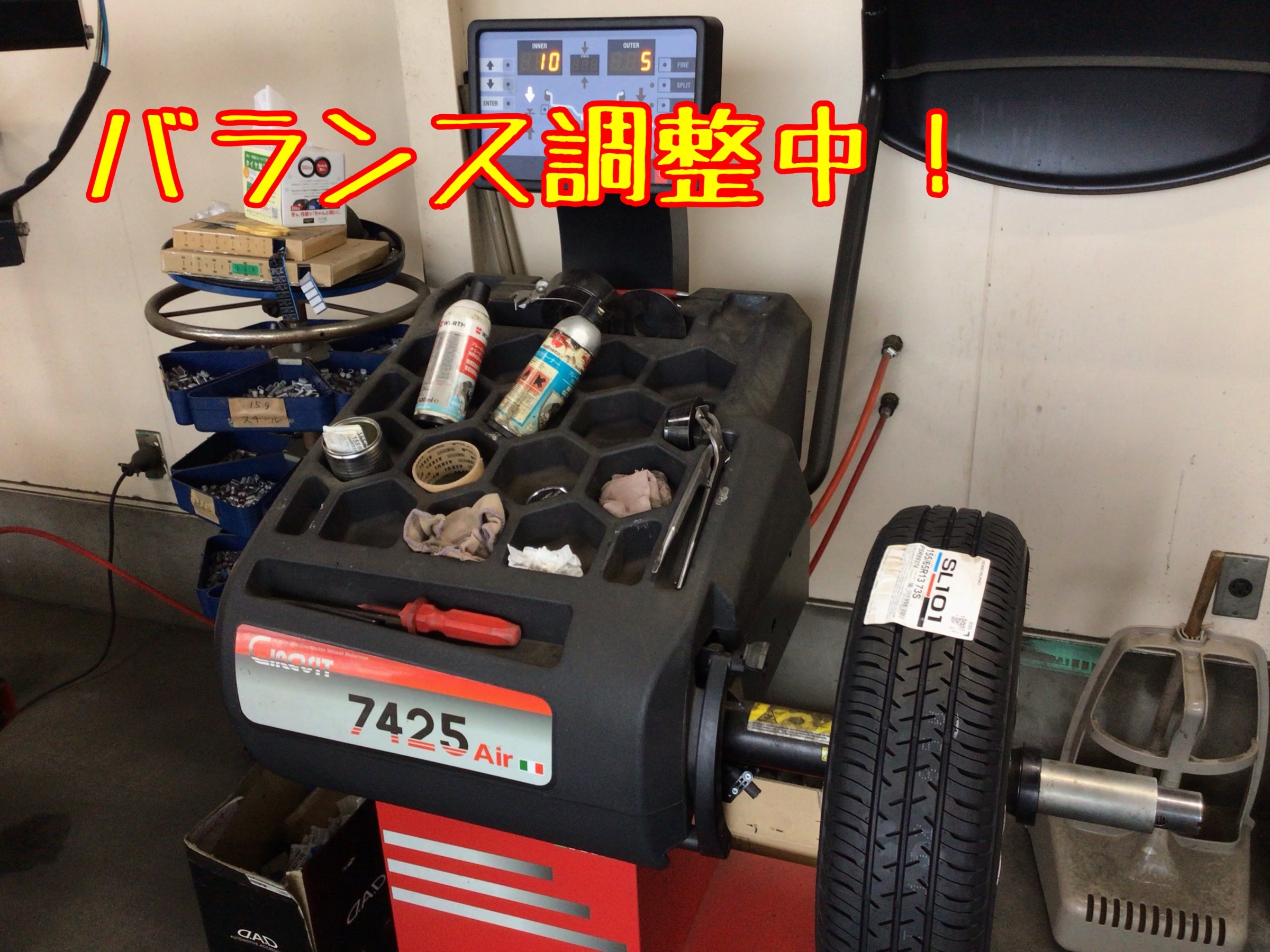 ↑作業中の写真です。新品タイヤを組み込み、ホイールバランスを調整します。