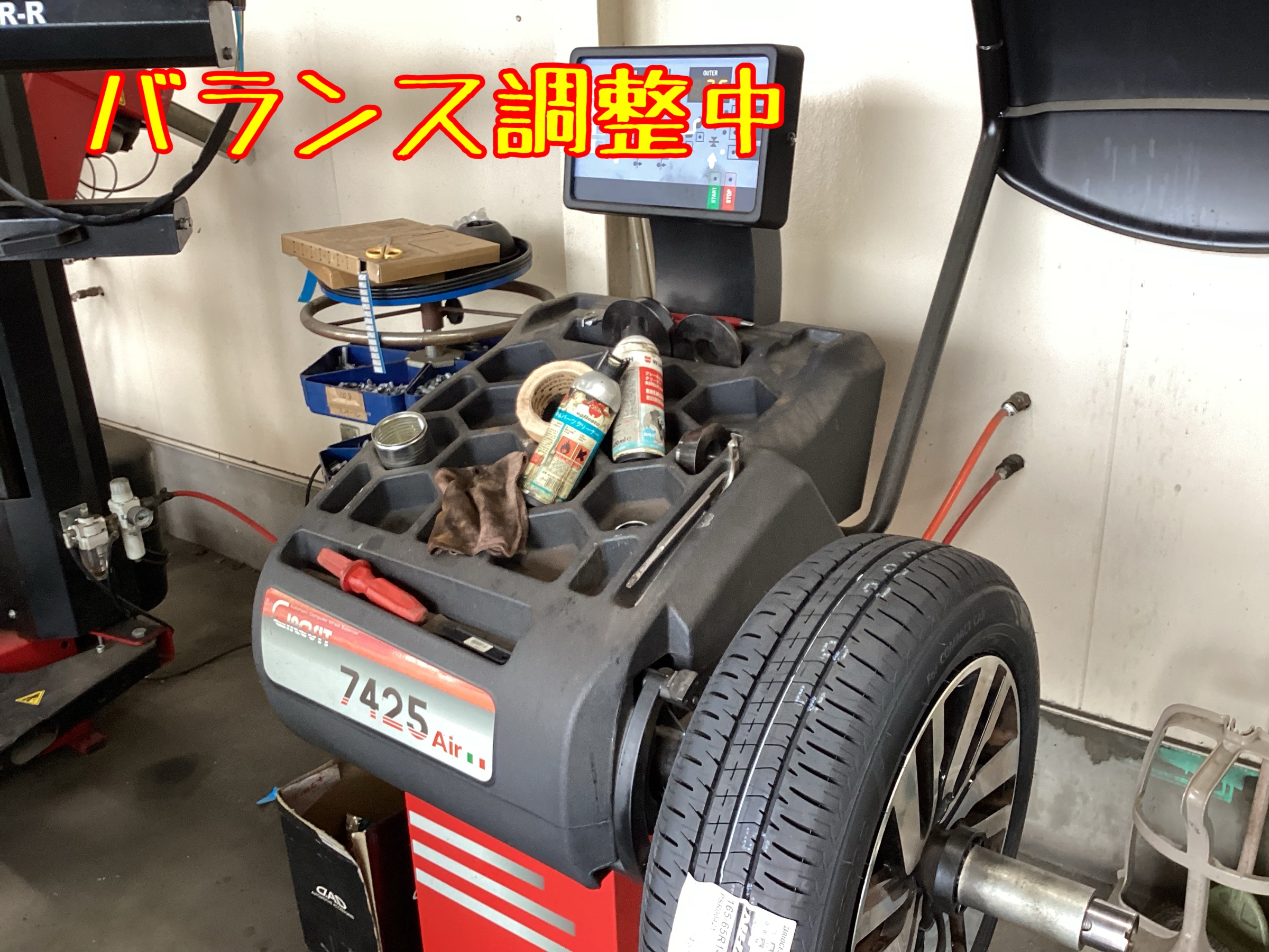 ↑作業中の写真です。新品タイヤを組み込み、ホイールバランスを調整します。