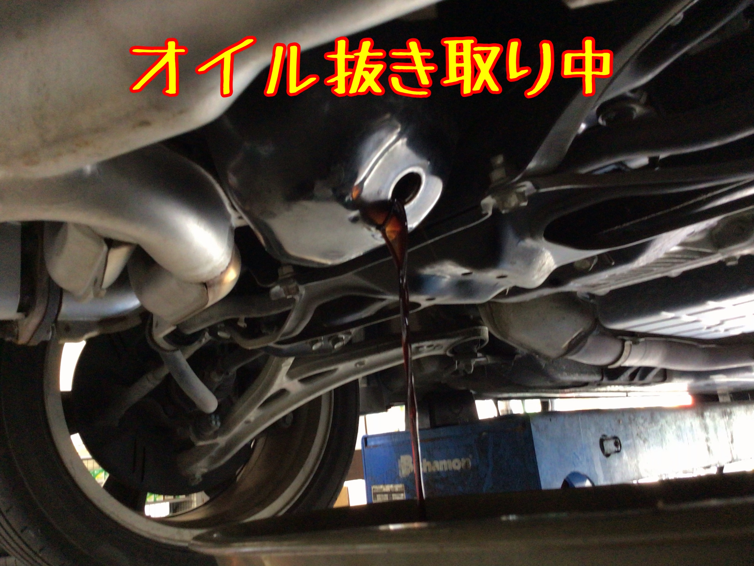 ↑作業中の写真です。車体下部よりエンジンオイルを抜き取ります。