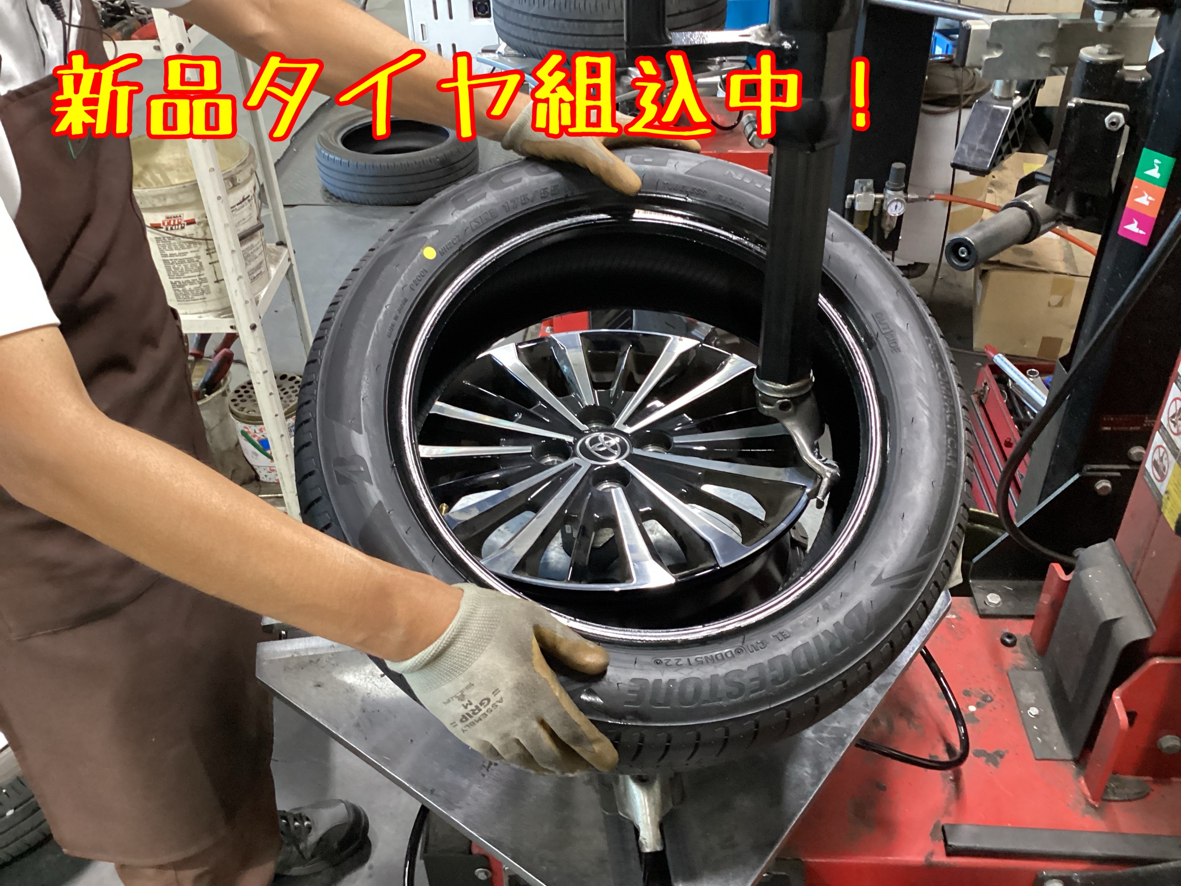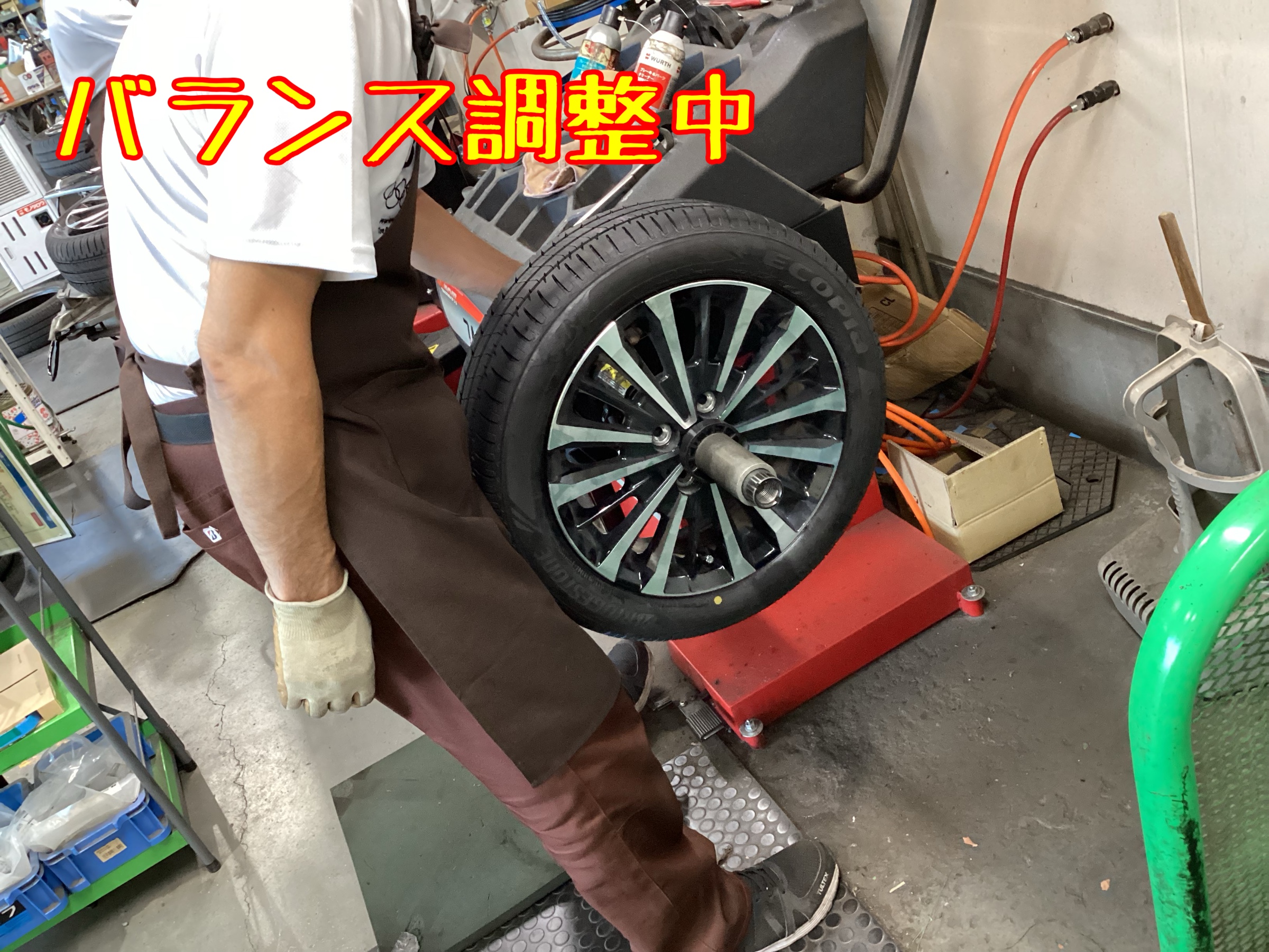 ↑作業中の写真です。タイヤを組み込んだら、ホイールバランスを調整します。