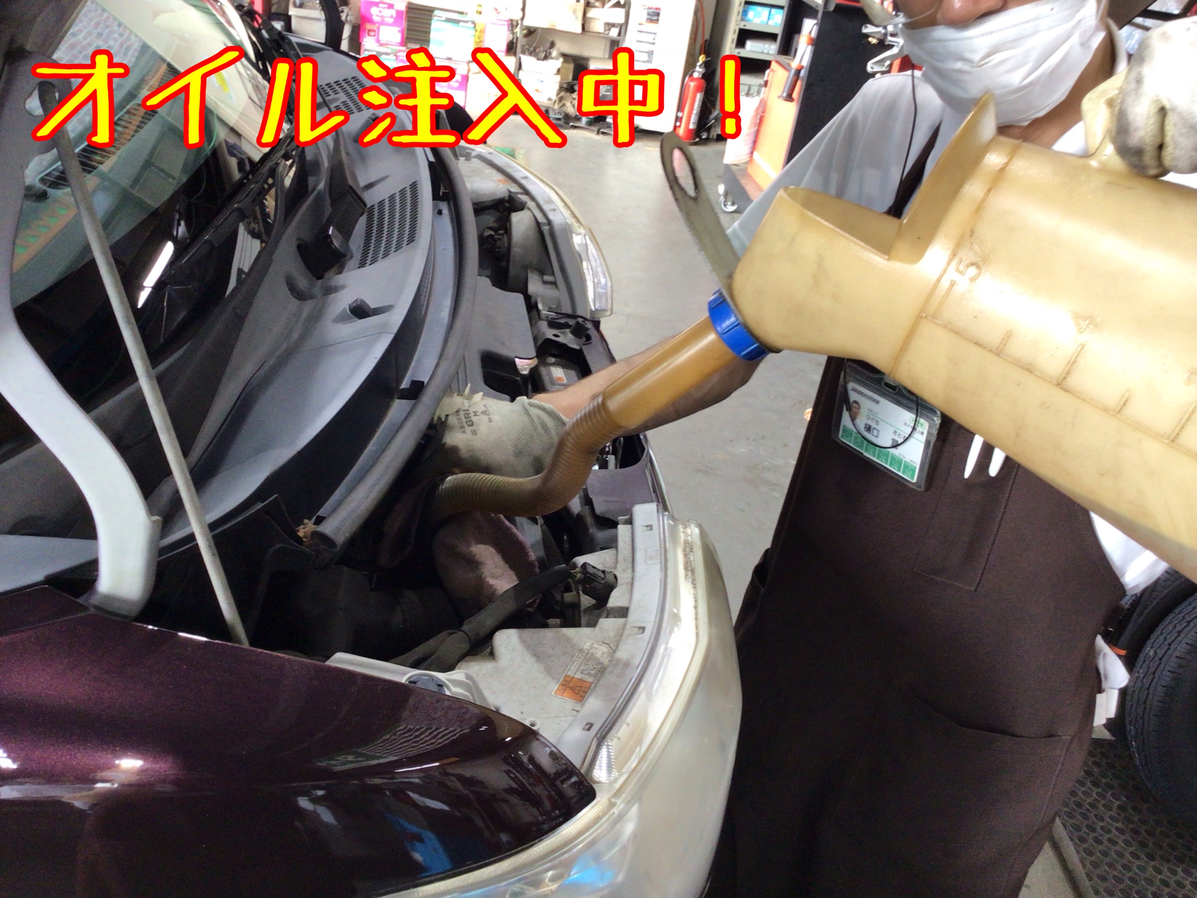 ↑オイル注入口から新しいオイルを入れます。漏れチェックを行い、