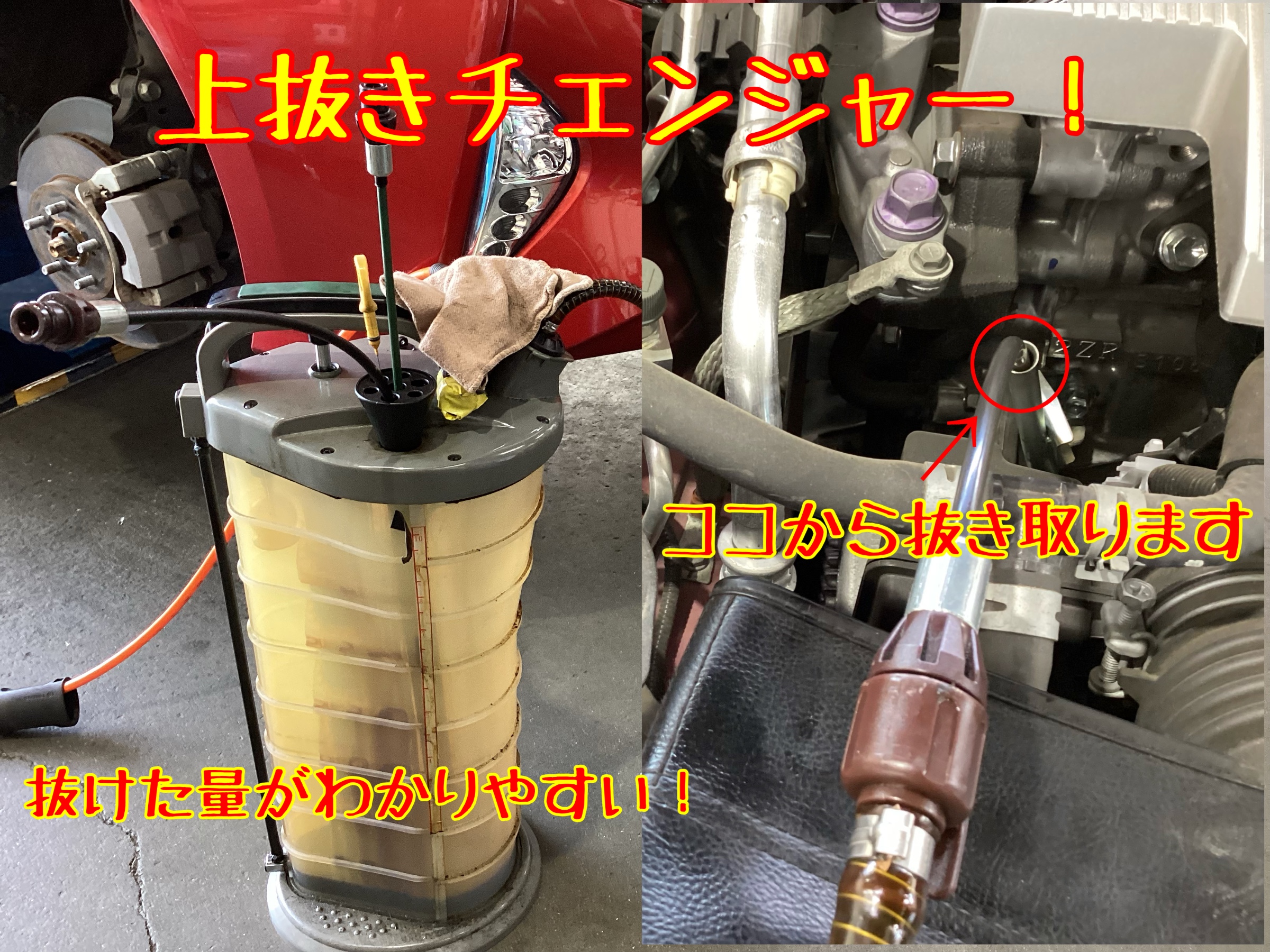 ↑今回は上抜きチェンジャーを使用して、オイルを抜きました。
