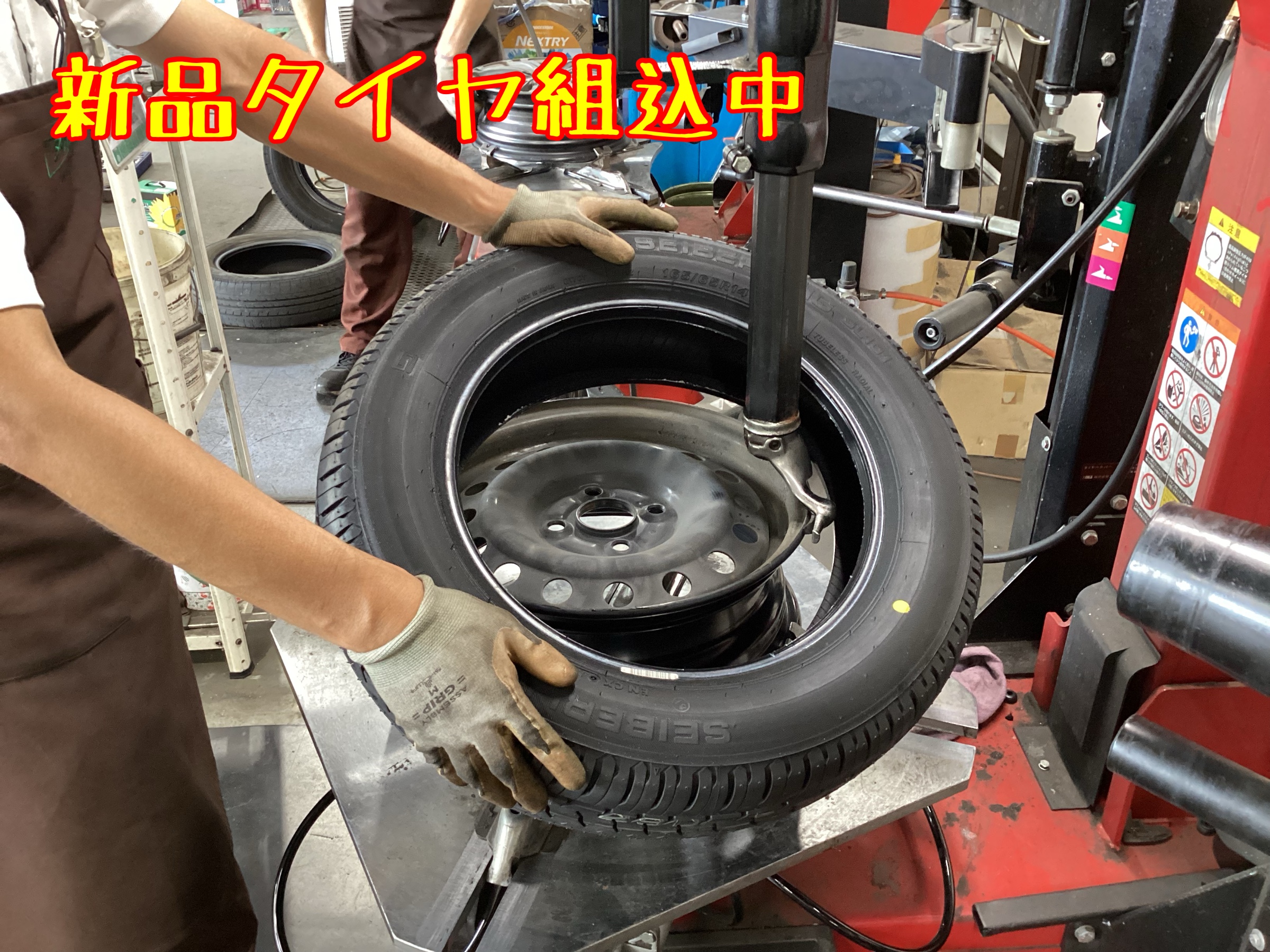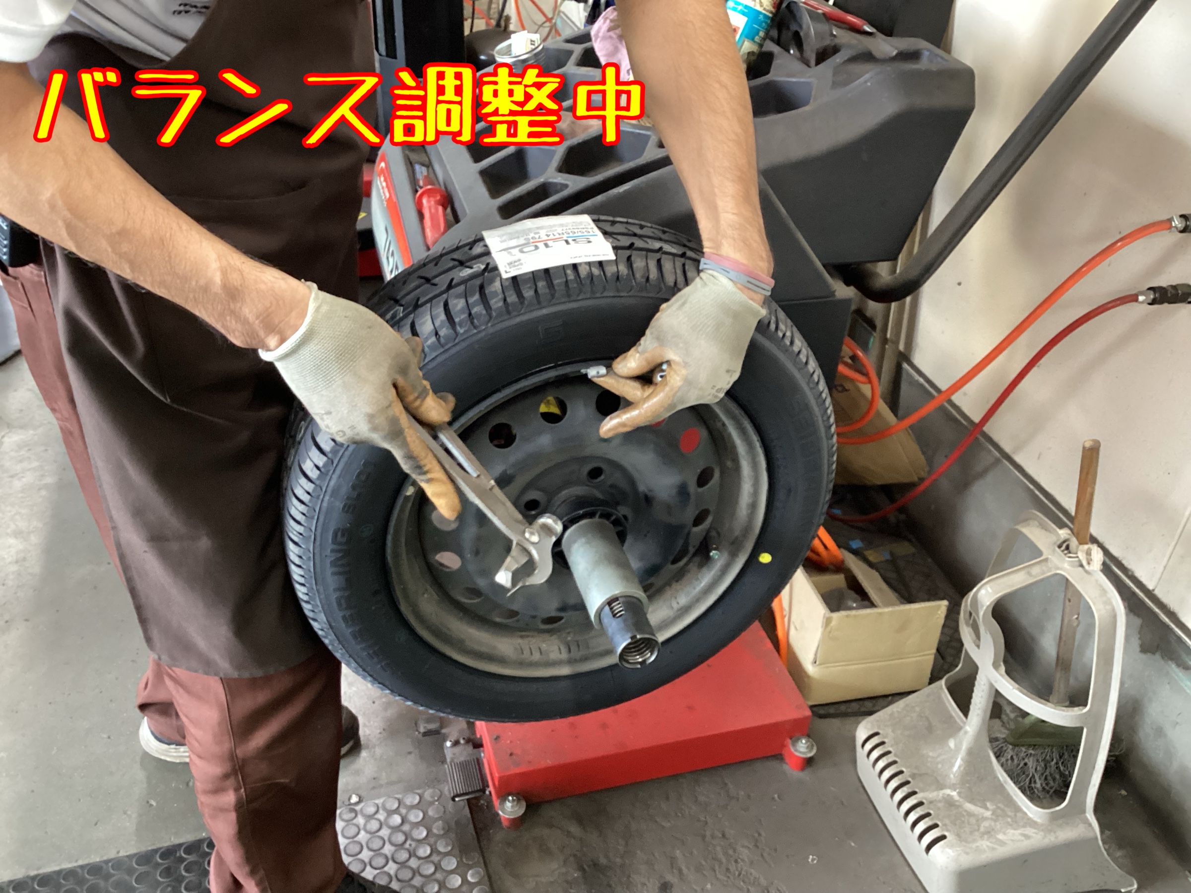 ↑作業中の写真です。新品タイヤを組み込み、ホイールバランス調整をします。
