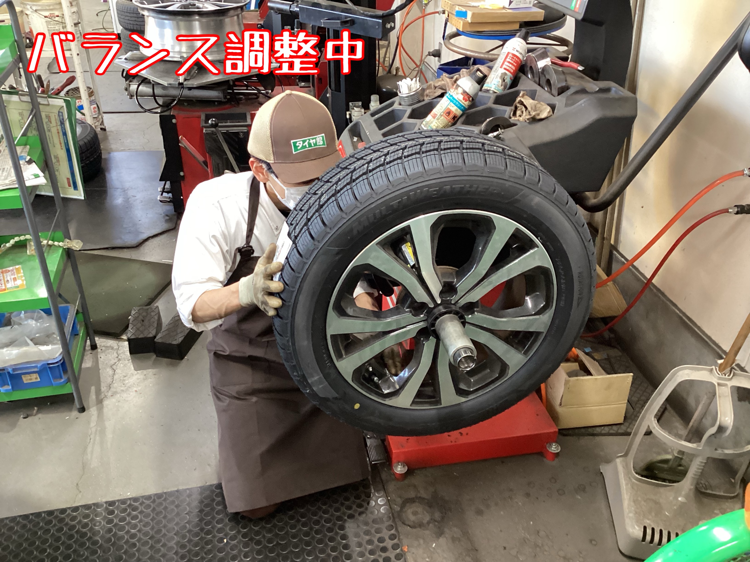 ↑作業中の写真です。タイヤを組み込んだら、ホイールバランスを調整します。