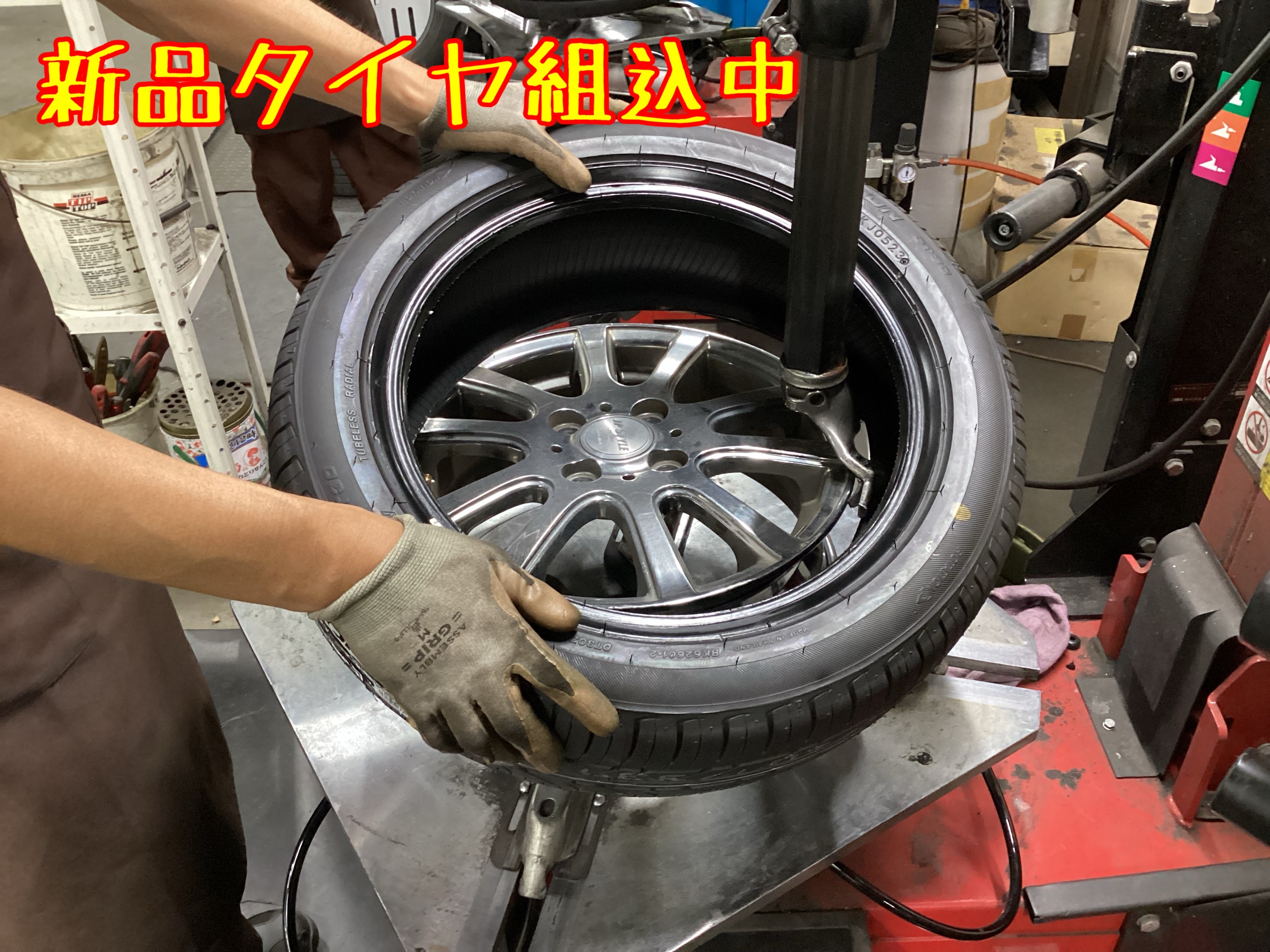 ↑作業中の写真です。新品タイヤを組み込み、