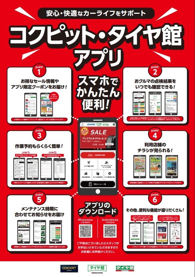 タイヤ館には公式アプリがあり、たくさんの便利な機能がございます!