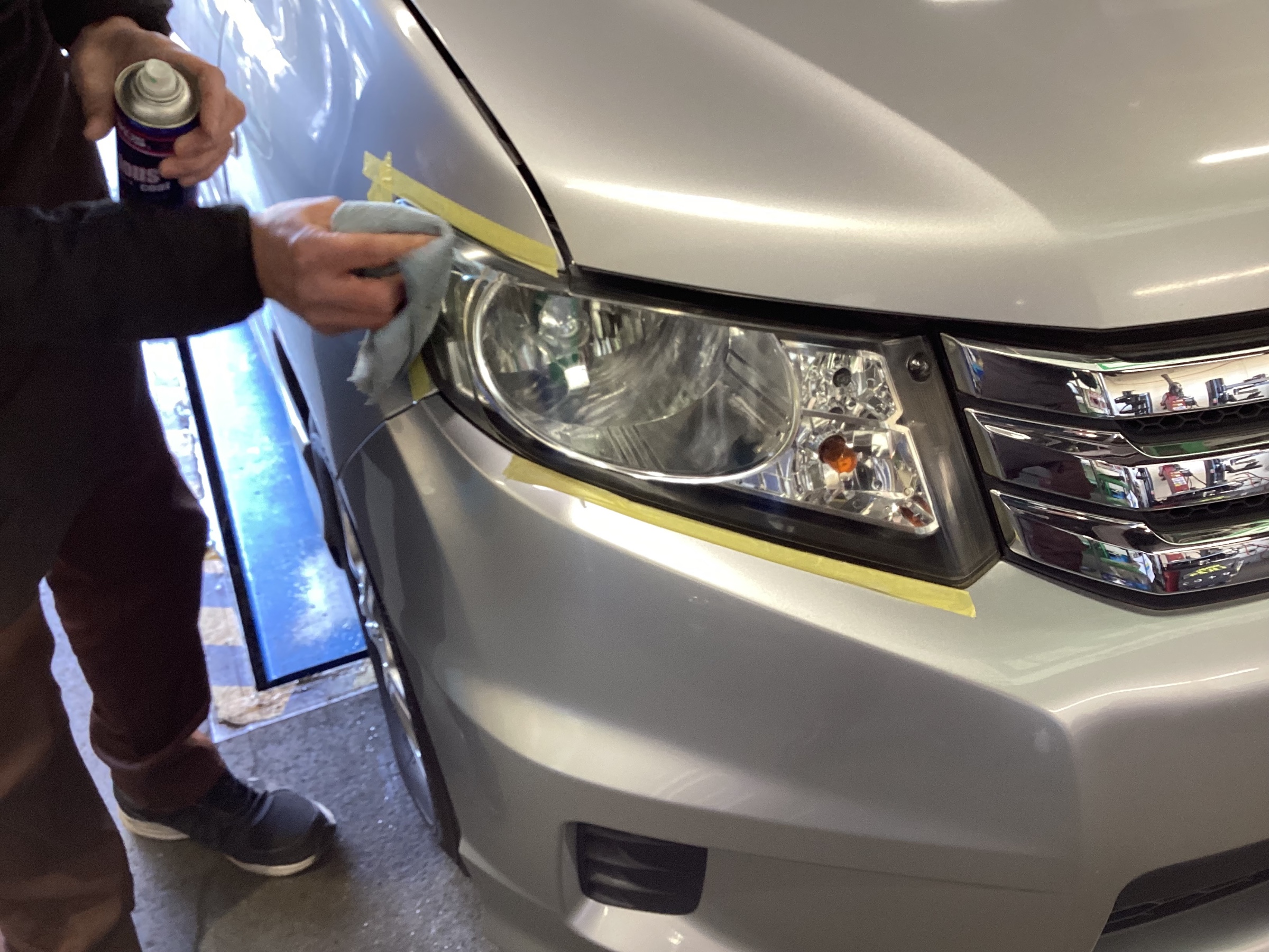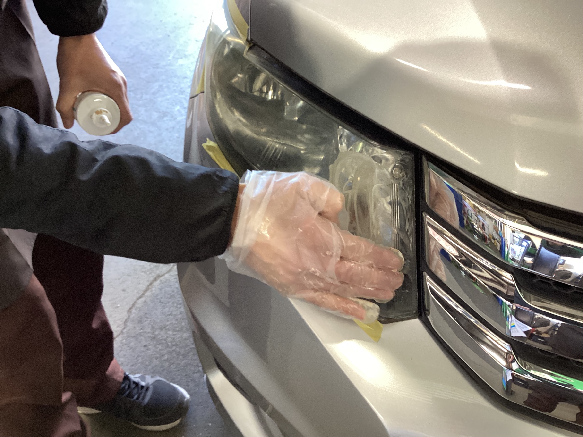 まずはヘッドライトを薬剤を塗って磨き、黄ばみを取ります。