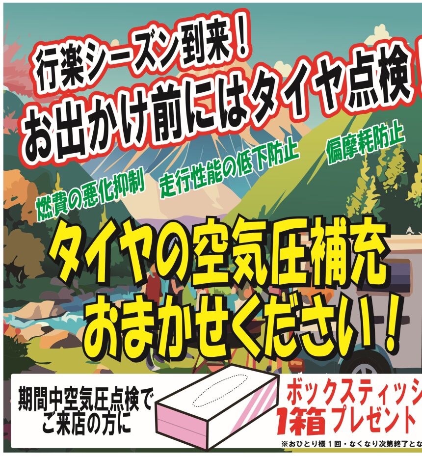 ただいま空気圧チェックにお越しの方にボックスティッシュプレゼント中です!